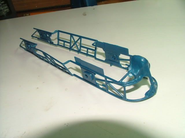 ![]() the frame out of the box. ![]() the frame modified a bit around the driver. i had to sand alot of mold lines and fill sink marks and small flaws. i only had some blurry black and white pics to go from but i feel the roll bars around the drivers head is pretty accurate and quite more representative then what revell provided. but there is a shroud that goes around the top and front of the bars that i will make later so if i would have left it alone it still wouldnt be so bad i think. the main problem was that it was in such poor shape and the bars go outside the shroud so that was the main reason i re-did the rollbars from scratch. tomorrow's forecast- warm ambition front moving in and 99% chance of having the wheels mounted. now that the games are over, its back to work. cheers all, Les
