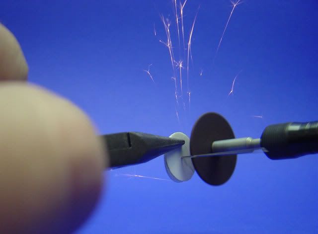 Anyone who is interested can contact me by PM Small step forward. The Scaglietti has two panels that cover the underside of the engine and the transmission. In the 1/1 I guess these are to improve aerodynamics and airflow under the car but in 1/24 the effect is to completely cover any detailing you do to them! The panels themselves have quite a lot of bolts and rivets molded in which could be detail painted or p/e and or turned parts could be used. The price of aftermarket turned rivets shriveled my chopsticks! I decided to do some turned metal parts of my own. Don’t get too excited though, in this case “turned” just means that I “turned” on my Dremel motor tool. Apart form my Dremel, I used my pin vice and a packet of around 50 sewing pins I picked up for $1. ![]() The under plate was drilled to accept the sewing pins ![]() To hold the pin securely and safely during cutting with my Dremel I made a jig out of styrene sheet the approximate thickness of my target length of pin shaft. I drilled a hole in the middle to feed the pin through. ![]() A second disc was placed over the pin head to hold it in place and the sandwich was held together with pliers during cutting – secure and safe. ![]() Next stage was to trim the pin to length using my Dremel with a cutting disc. First I cut it more or less to length (I hope you like the pyrotechnics in the photography)… ![]() … and then ground it down to the desired length. ![]() Useful/important tips at this stage: The pin heats up very quickly from the friction and this heat in turn softens the plastic disc. Therefore I found it much better to apply the Dremel to the pin in short bursts so as to keep the temperature down and allow any heat to dissipate. also. I replaced the top, “holding” plastic disc with a piece of metal. This acted as a heat sink and greatly reduced the problem (but did not completely eliminate it). With very little time and effort you should end up with a nice little pile of “turned” real metal rivets for under a dollar. ![]() In the last picture you can see the rivets in place on the under plate. They were fixed in place with a dab of thick CA glue from behind set quickly with dab of Zapper. (BEWARE of using thin CA, I did first time round and glued my finger to the front of the piece and had to strip and repaint LOL) |