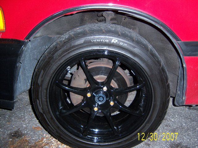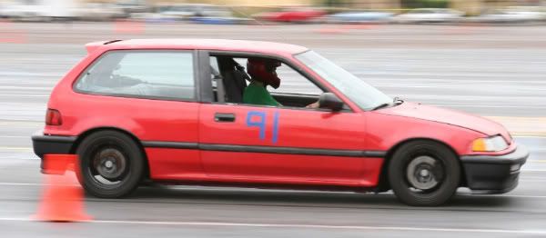 Eibach prokits that came on the car (may have been from an integra.) ![]() ![]() Before settling just after install. ![]() Right now you cant get a finger in at a 45 deg angle..much less straight. I cant raise it anymore than that right now. I got my GC's from the junkyard off a mazda mx-3. They are too short, that is maxxed out. Im about 1/2"-3/4" from the bumpstop. But hell, I got em for 50 bucks. I did break down and order longer springs for the front. I have 2 12" springs of the same 300 spring rate sitting next to me waiting to be put on. Also, this is what my unmodified camber looked like. ![]() And me running an autocross. this is a very slight left hander.
