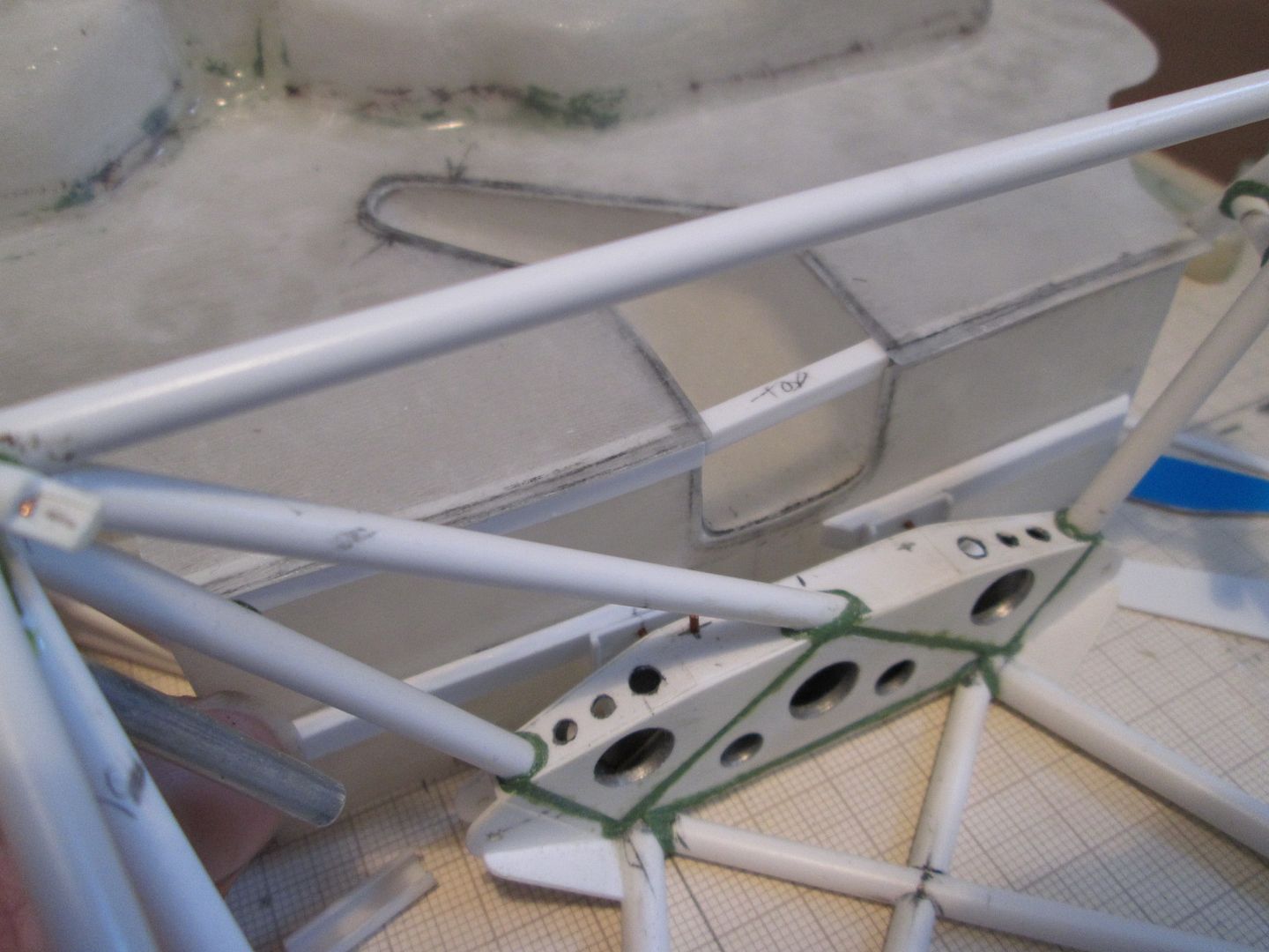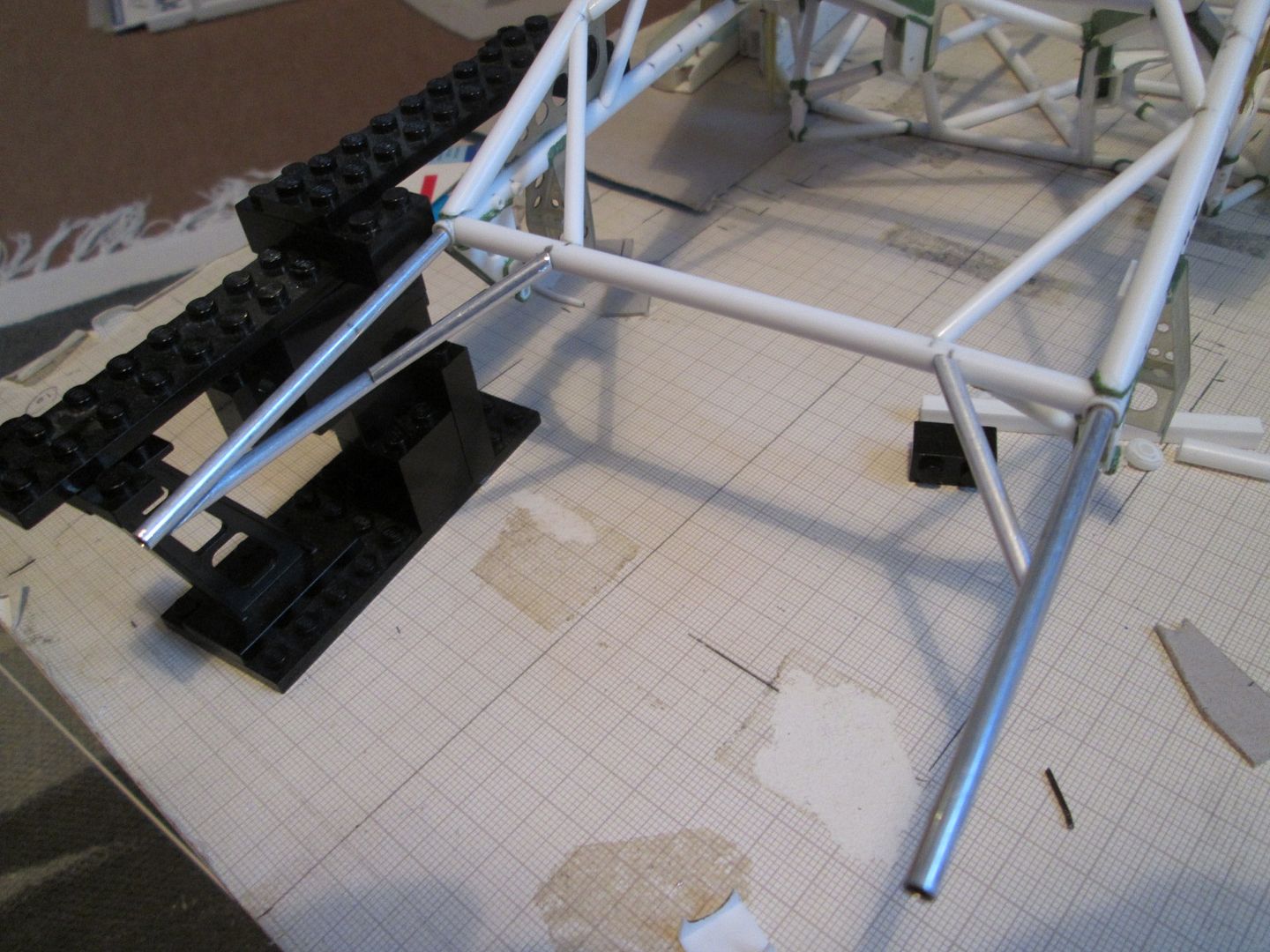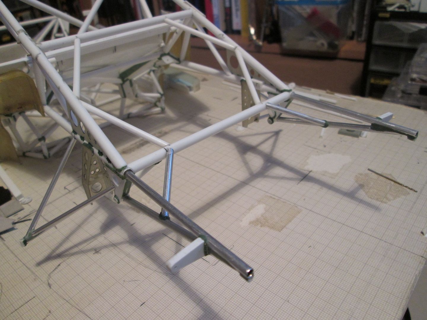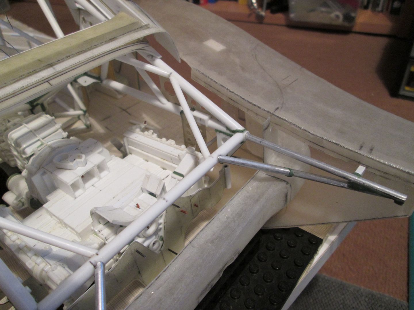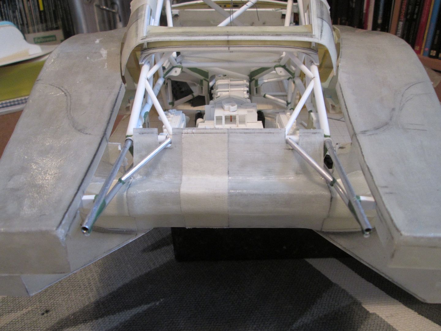 I've been saving all sorts of things for this update - it's not a case of lack of progress, it's more that I've been making progress in several directions at once! First up, continuing with the rear bodywork support frames: ![]() The small diagonal tubes were particularly awkward - it didn't help that I wanted to pin both ends. As usual, the Lego helped to keep things in line. Next, there are two small 'ears' which support the back end of the two outer wing panels. These were cut from solid styrene, with two drillings to pin them into the main ali tubes, and a third L-shaped pin to help anchor them in place: ![]() The tricky part with these frames was how to secure them to the back of the chassis, to cope with the weight of the bodywork. Although I had added ali (or was it brass?) tubing inside the main styrene chassis tubes for strength a long time ago, this tube was pierced in several places where I'd pinned other tubes and brackets in place - so I couldn't sleeve the bodywork frame too far inside. To improve the situation, I filed the ends: ![]() Here's the frames in place: ![]() I've greenstuffed some of the joints already, including the two styrene 'ears' - the small L-shaped pin is buried inside. There's a couple of extra small details still to come, but these frames are now a permanent fixture. With the other small ali outrigger frames added too, there's suddenly a lot going on back there. Moving on, here's the interior cover panel for the gearbox after an initial trimming and fitting session: ![]() The fun part will be getting it to fit around the tubes of the main roof structure - more on this next time. With the tail support frames fixed I could start trimming the main bumper section: ![]() I wanted to keep the bumper in one piece for as long as possible, although in time it will be cut into three. It soon became clear that a mk2 version would be required - I needed a little extra material on the top and bottom edges to get a better fit with the outer wing panels, the centre section needed 'adjusting' to give me clearance for the turbo units, and the exhaust would need altering to get the hole in the right place! Other than that, it was fine... ![]() You can see above where I've had to pull the bumper away from the main chassis frame - I've got to get the turbo assembly tucked away under there eventually. You also get an idea of how the outer section of the bumper will be added to the wing panel / fender. So, last week was another fibreglassing session, starting with the mk2 bumper (with angled centre section): ![]() ...rear wing mainplane: ![]() ...and a folded panel for the endplates: ![]() The foam core was wrapped in fibreglass cloth with no release agent - it wasn't coming out. Three layers of cloth, and that was that - a light, stiff wing plane. Keeping the foam core in place would present one obvious problem - how to glue the end plates? My solution was to drill two 1/8" holes into the end, then add a styrene 'plug' to which the end plate can be glued: ![]() Finally, in amongst all this I've been fitting the mk3 front bulkhead. I used the mk2 version as a reference and fiddled with cardboard templates to improve the fit with the outer wing panels: ![]() By the time of this final photo I'd added the channel for the steering column, some styrene detailing on the lower vertical section of the panel, and you can just see two small brackets down the bottom which are for 'bolting' the tube frame chassis to what's left of the 911 bodyshell: ![]() So, plenty of progress and more to come. I hope to get more done with the rear wing this week, and will continue detailing the front bulkhead. A return to the cockpit and dashboard is looming, but I suspect that will be a job for my holiday later this month. Have a good week, SB |