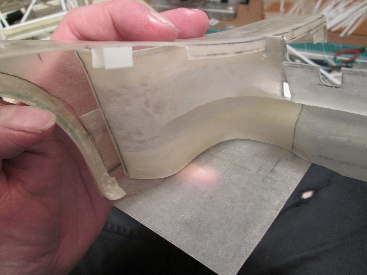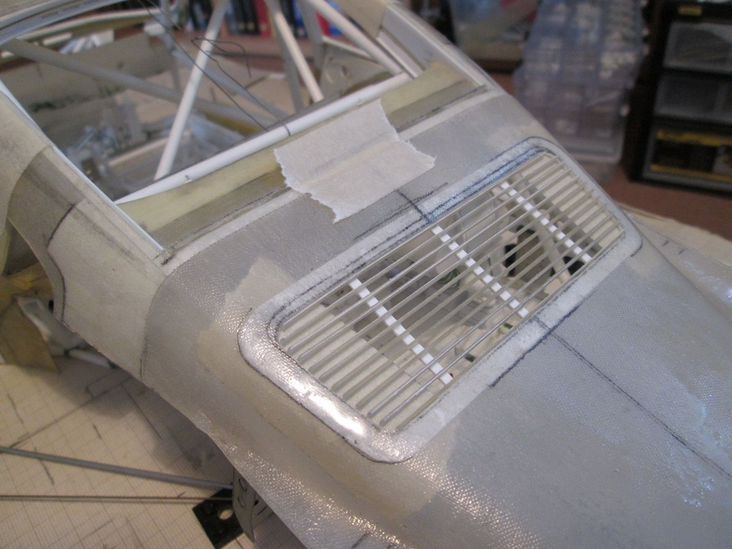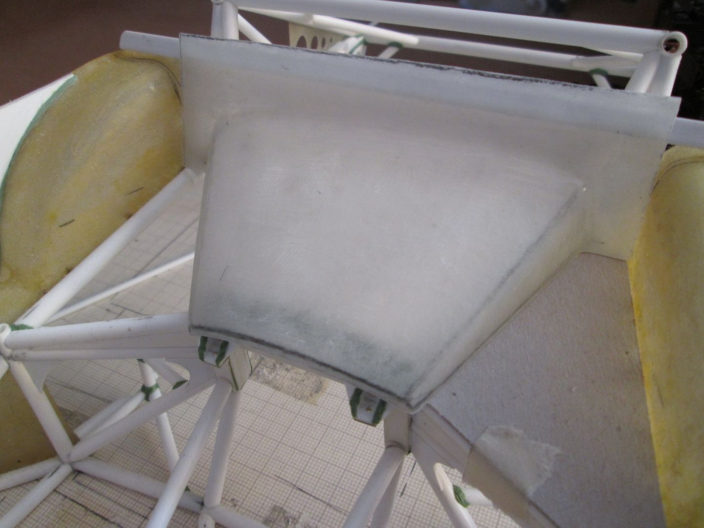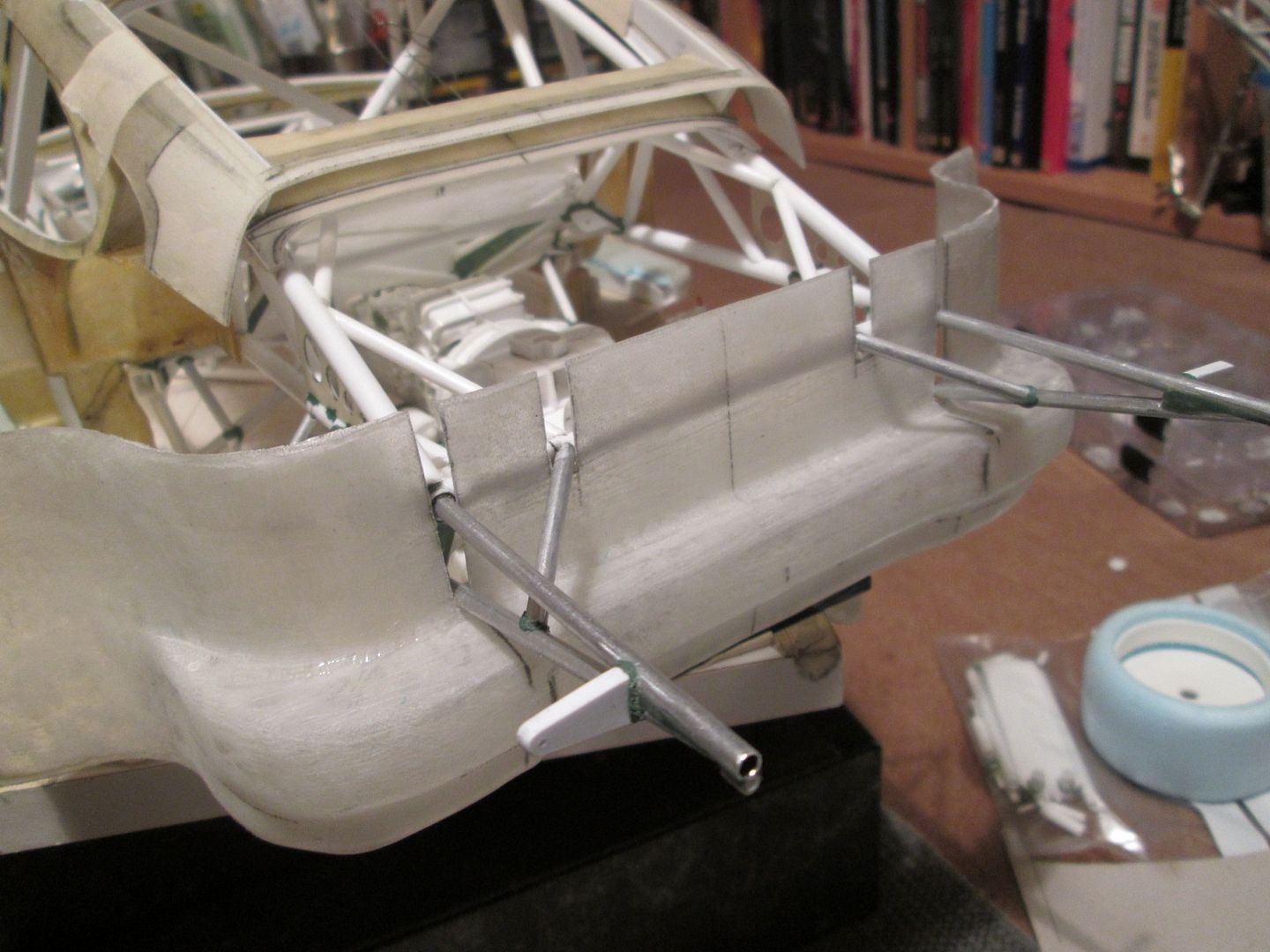 Odd time for an update (from me, anyway) but I've reached a good point in the build and wanted to show what I've been doing before getting on with the next job. I've certainly had a productive week, but I'll start with the mk2 bumper panel which made a brief appearance during the last update. The extra height I added to the mould has allowed me to get a better fit where the outer ends of the bumper panel are wedged into the rear wings / fenders: ![]() ![]() Getting this to work properly has been frustrating at times, and still needs more effort before I'm ready to start gluing parts together. I'm still reluctant to cut the bumper panel into the three sections just yet, as it's too useful to have it in a single piece. The angled panel over the top of the turbo units appears to work well - it should provide enough room for everything to fit. I'll return to these parts in a while. Next, a piece of destruction rather than construction. When I had the mk1 version of the bumper panel I realised that the turbo exhaust pipes were not going to be in the correct position. I'd modelled them as being horizontal, but the engine actually sits in the car at nose-down angle - so the tailpipes were now pointing upwards. Now, I'm not claiming total accuracy for my bumper panel measurements, but I knew that I couldn't make it all work as it was - the best solution was to adjust the angle of the tailpipes. Rather than completely re-make these parts, I made a pair of new flanges from styrene tube and half-round section, then separated the old flanges from the tailpipes: ![]() Moving on to this week, I decided to spend time on the rear wing - the mainplane was easy enough to trim to length, but that still left the main supports to work out. Once I'd settled on a shape for a template, I cut five panels for each support from a mix of 0.75mm and 0.4mm styrene, giving a total thickness of just over 3mm. I then added a length of 1/8" ali tube to create the leading edge, and to provide some strength and (hopefully) structure: ![]() As I glued the styrene panels together I created a channel in the front edge, into which I could pin and glue the ali tubes: ![]() From here it was a question of shaping and filling the trailing edge to create more of a teardrop profile, then adding brackets to attach the mainplane. The stay is small-diameter ali tube with a length of wire inside, with 3mm styrene rod and hex used to create the rod-end joint detailing. I kept a small piece of the left-over mainplane to use as a place-holder, rather than risk screwing up the actual part: ![]() More of this later! Working on the wing and the engine cover extension panel gave me the impetus to tackle the rear grille. I worked out the basic measurements, and used one of my photos of the Silverstone Kremer 935 to get measurements for the spacing and the thickness of the grille slats. Thin styrene would have been ideal, but I was concerned about it distorting over time when glued together, so decided to use some of my flat-sheet fibreglass instead: ![]() I cut the slats approx. 2.5mm wide by about 100mm long, then made the three supports from 2mm wide styrene. The fiddly part was adding the extra lengths of styrene across each support to create the correct spacing, but they were easy enough to trim to length afterwards. I then taped the three supports in place on a piece of cardboard, and started CA'ing the slats into position: ![]() The slats were then cut to length to match the shape of the hole I was busy cutting into the rear deck. The hole edges were built-up with layers of styrene sheet and lengths of strip, as I worked out how to create the rest of the grille. Mesh was added to the underside and CA'd in place, with 3mm strip added as extra support. Finally, another styrene plate was cut which would fit around the whole lot and hold the grille in position: ![]() ![]() Eventually the grille section will be painted black and can be glued into the rear deck panel. I've shaped the outermost ends of the slats to follow the curve of the bodywork, too. So far, I'm very happy with the result - it's not a job I'd planned to do this week, but given the time it's taken I'm glad I did! Here's a shot of the rear deck with both the wing and grille panel in place - I trimmed the wing end-plates to size and pinned them into the styrene inserts shown last time. I added two small lengths of 1/8" ali tube into the trailing edge of the mainplane to create sockets - I then glued small styrene pegs onto the inner face of the endplates so that they were held at the correct angle. In time the whole lot will be glued together properly, but for now it's staying loose: ![]() ...and here's the required shot of the full car, with nose and whale-tail in position! ![]() I have to do this from time to time, as it reminds me of what I'm working towards - getting the wing and grille sorted are both sizeable jobs crossed off the 'to do' list. So, it's definitely been a productive week - and it's still only Friday. The next job I'm planning to tackle is the floor: I want to get some strength into the chassis structure, as the front end is vulnerable until the main roll-cage is added. Styrene sheet is too flexible, fibreglass is better but not good enough...maybe if I had a sheet of carbon-fibre I could use? More on this next time...! All the best, SB |