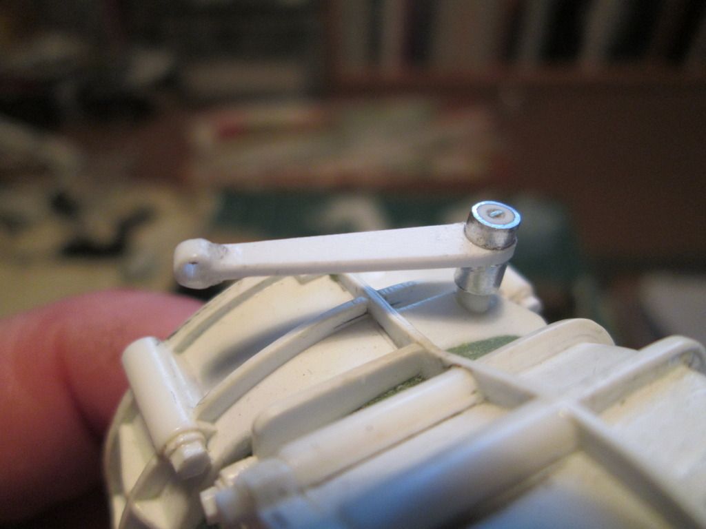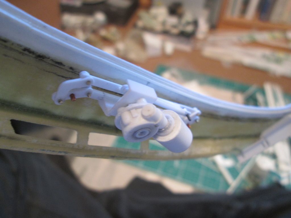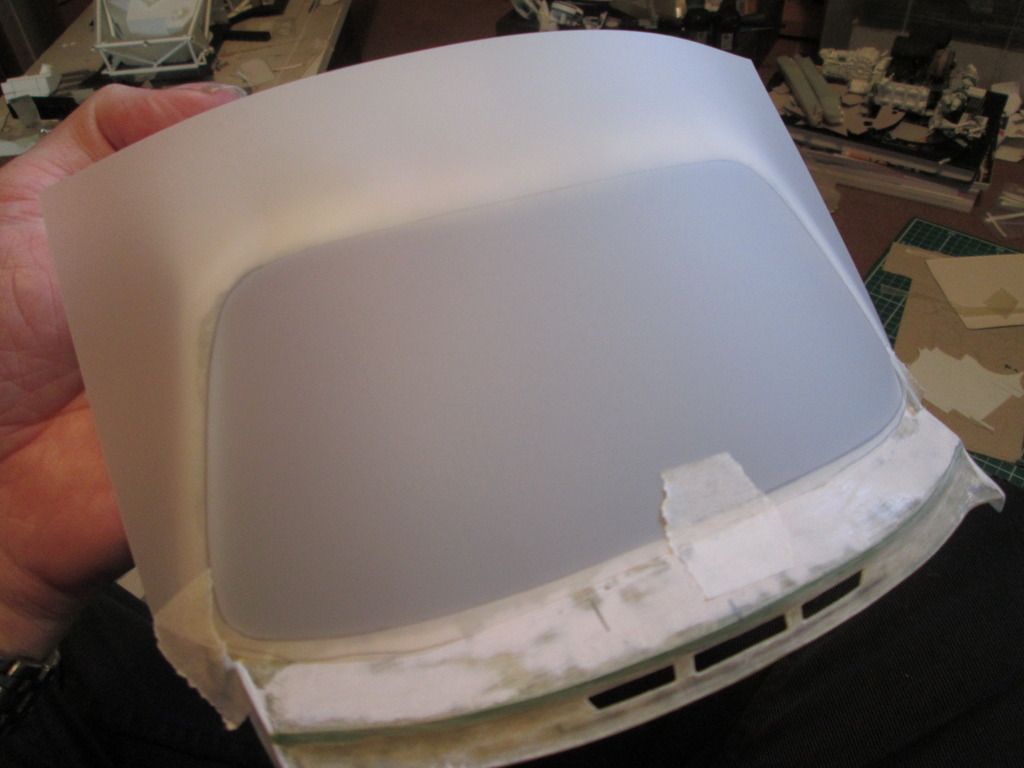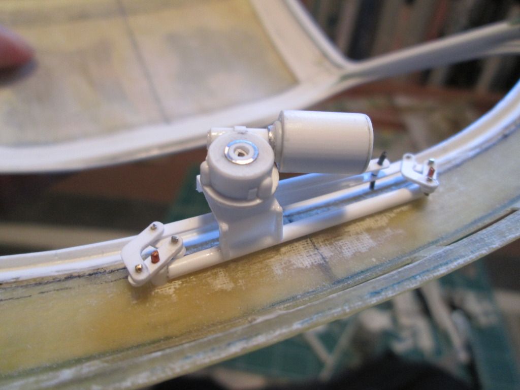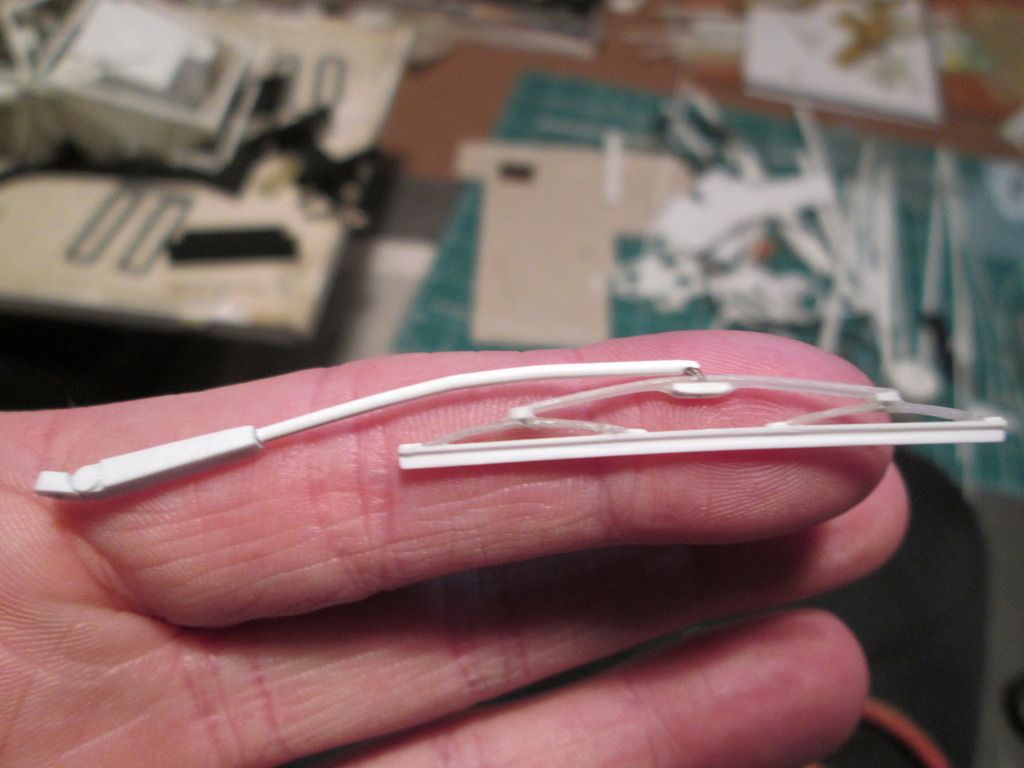 ![]() This small valve unit will attach to the upper X-frame and allows the cold oil to return to the main tank without having to pass through the cooler in the nose. At a pre-determined temperature the valve closes and the warm oil can be cooled. Next, a slight change of scene: windscreen. I started the next job by taping some draughting film to the roof section: ![]() After cutting this out, it was obvious that the top edge of the windscreen opening needed some modification - the curvature of the screen didn't match. So, the first job was to create a lager lip around the inside edge with thin strip styrene - this will give me a firm fixing point for the screen later on. Next, I built up the top edge of the roof with wider styrene strips to get the approximate shape I wanted: ![]() After some filler and fettling, I ended up with this: ![]() I've since obtained some thicker (0.6mm) clear plastic to use as the screen, so it won't be long before I cut what will hopefully be the final version. I've just got to work out (a) how I glue it in place and (b) how I add a 'seal' around the outside to camouflage the join. Next up - windscreen wiper. This is one of those parts that is so thin and fiddly that accuracy of the design is not the main concern - it's about making something that doesn't fall apart when you look at it! So, I turned a length of 1.6mm I-beam into a T-beam and used this as the blade, then added the arms made from thin strips of curved fibreglass: ![]() I didn't want to use styrene strip for the arms as I wanted to avoid the possibility of distortion. The main wiper arm is a length of plastic-coated wire rod, so this can be trimmed and bent to shape as required. After this, it made sense to make the wiper motor and drive assembly (even though it's buried away under the dashboard). There are no shots of this amongst the Freisinger photos, so I dug around online for appropriate images of regular 911's and used these as the main reference. Although the mechanism can drive a normal pair of wiper blades, many photos of the factory car show it with just a single wiper on the driver's side. Here's the mechanism plugged into the underside of the windscreen surround: ![]() ...and flipped the right way up: ![]() The measurements are all based on best-guesses and what-fits. The linkage isn't intended to be functional - it's just got to look 'kinda right'. I just need to do a little tidying of the pinned joints and add a few little details to the motor section. One side-effect of fitting this into place is that I now have to modify the dashboard top to fit around it - that's another job for the coming week. So, a bit of variety for this update. I've also been getting some supplies in place for some spray-painting - the bare-carbon floor might not be 'natural' for too much longer... All the best, SB |