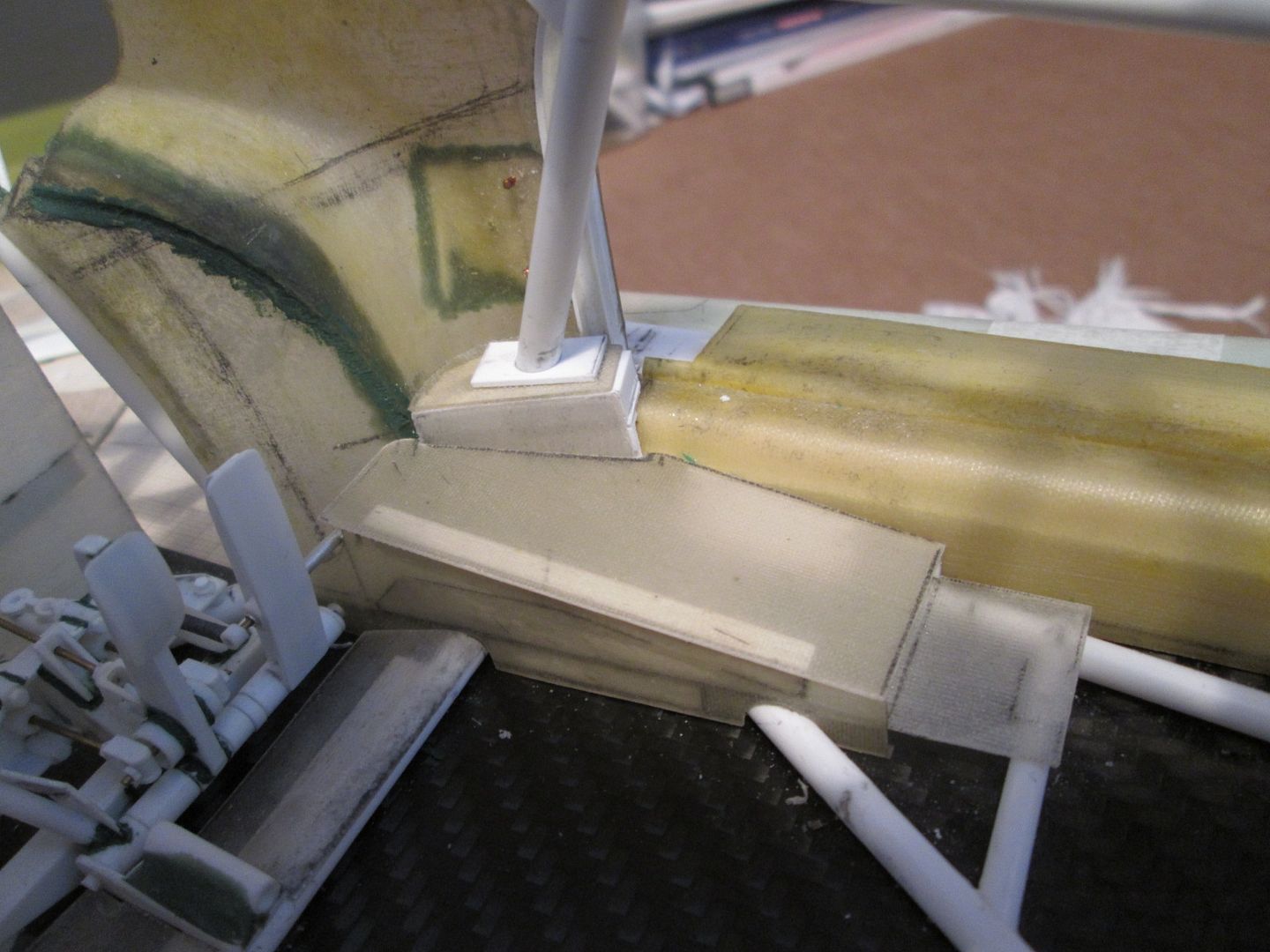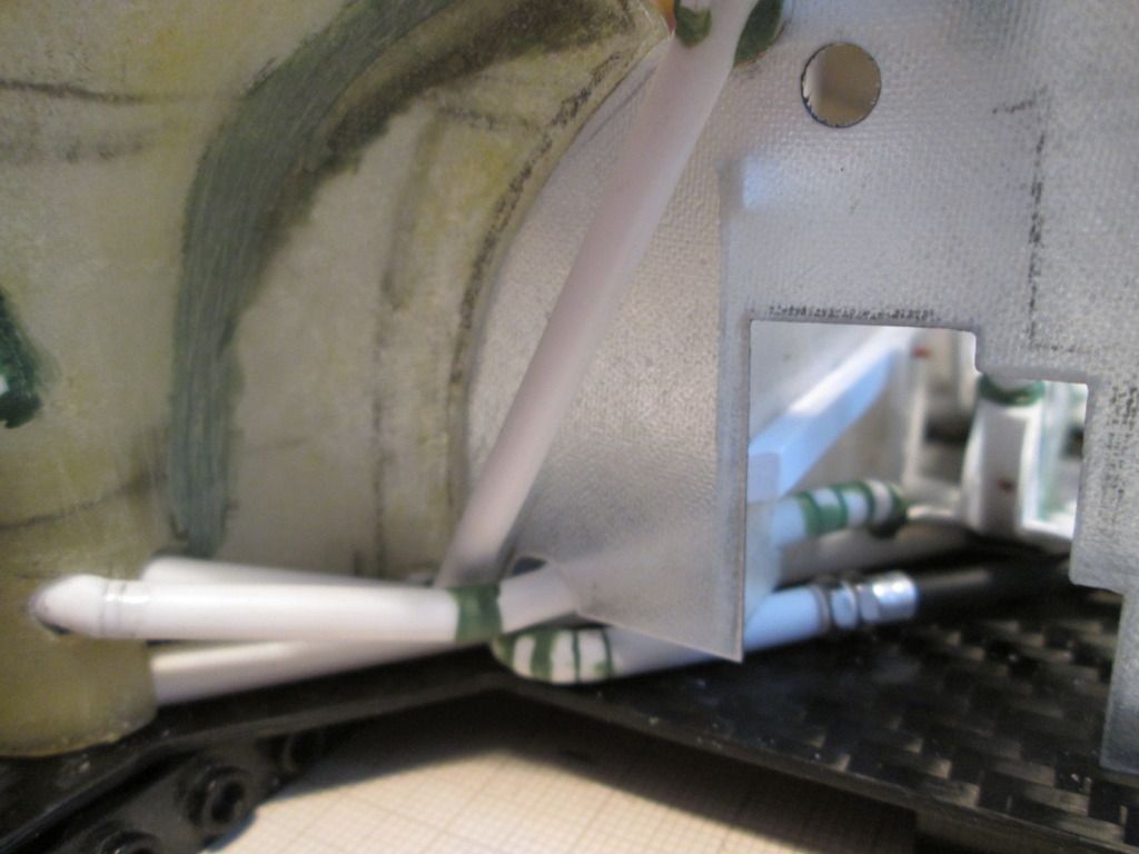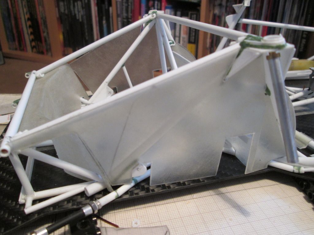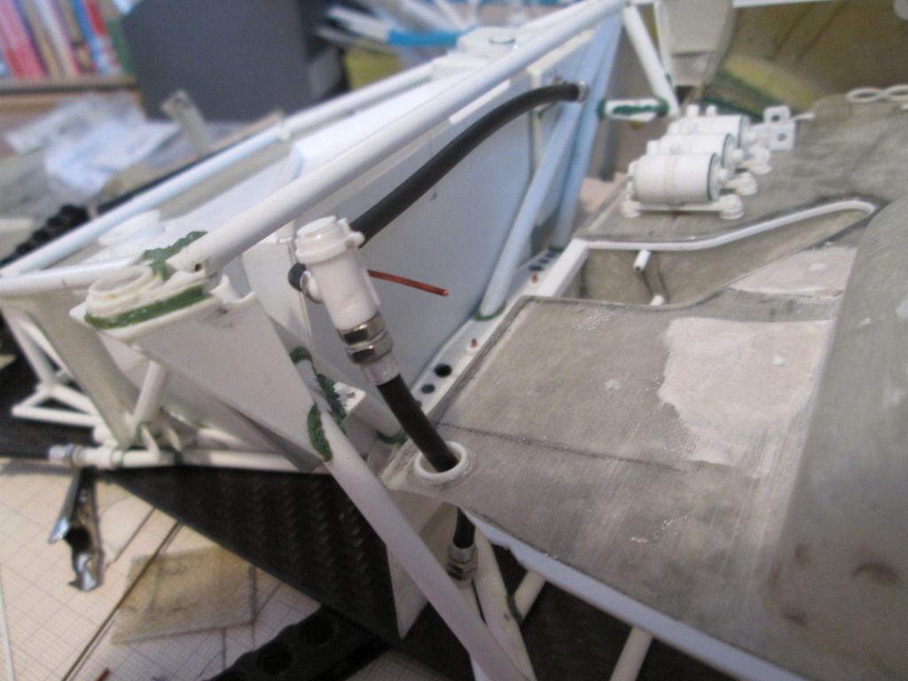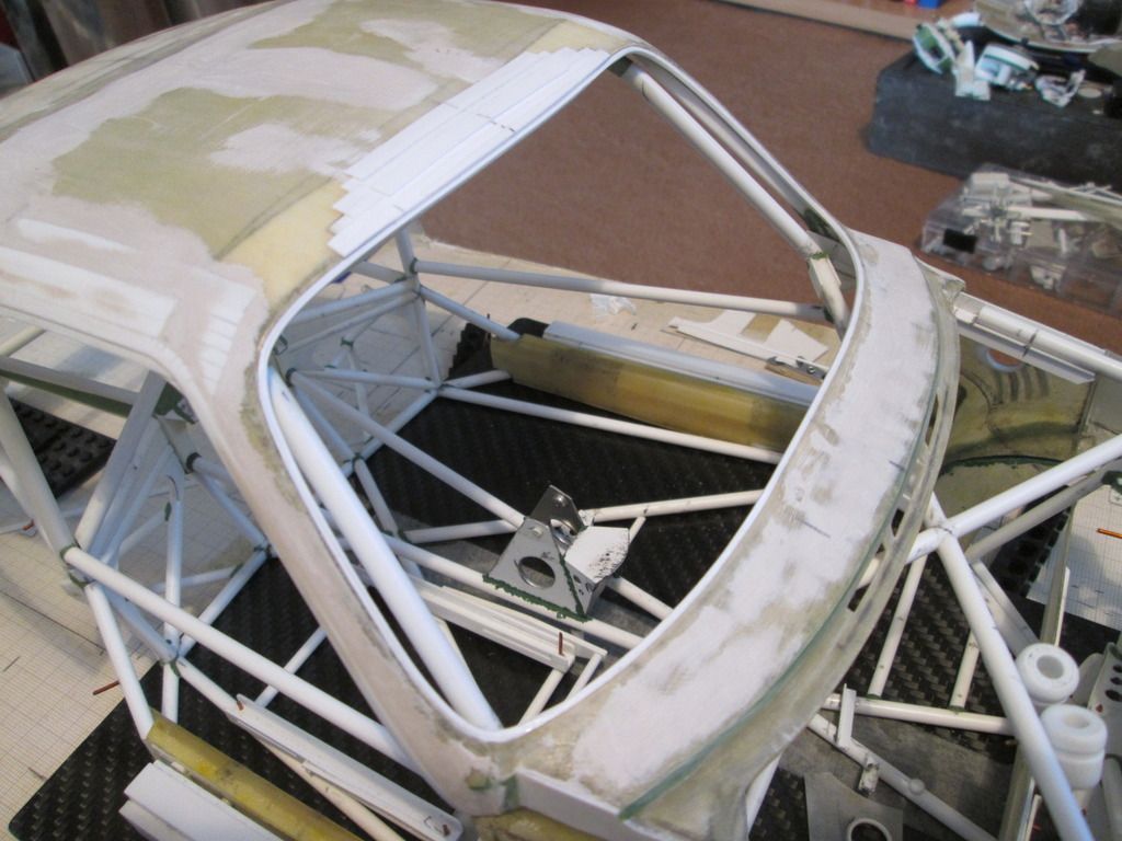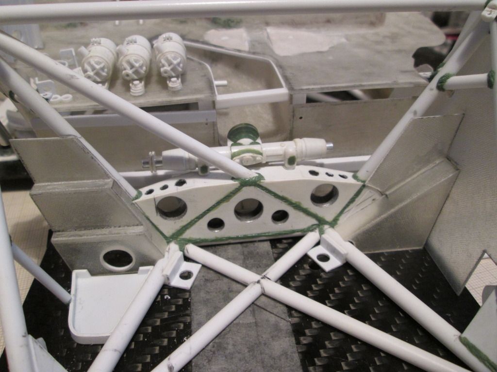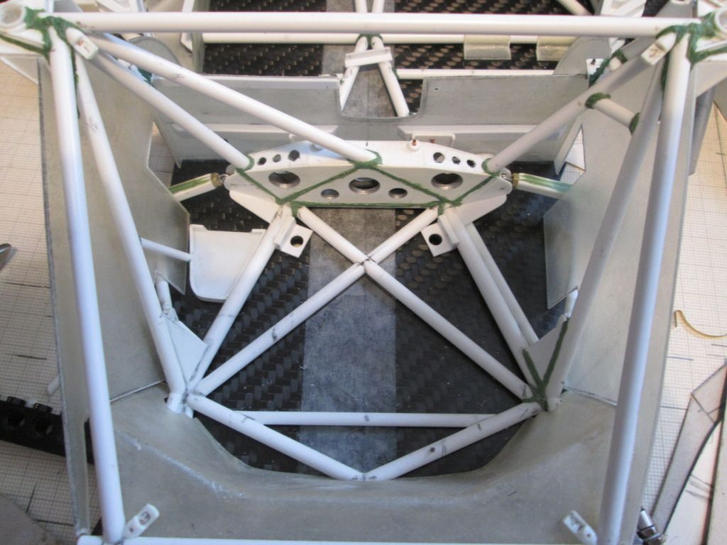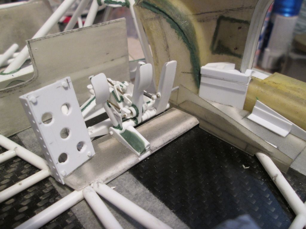 Slowly moving towards the time when I can start fixing some of this stuff together. I'm just trying to do as much as I can before that point, as there's bound to be something I forget to do which instantly becomes twice as difficult when the floor is attached! First up, here's the main inner sides panels for the nosebox in an early stage: ![]() I'd made the cardboard patterns for these ages ago, but now was the time to cut them from sheet fibreglass. The cut-outs around the suspension strut top mount were tricky, but I've been able to do them without being too gappy. This particular lay-up came out at 0.55mm thick, but it's quite flexible - the innermost section is vertical where it meets the wheelarch, but it then twists slightly as it moves forward along the nose of the chassis. The cut-outs for the wishbone and steering help it to flex, too. Here's the view from above: ![]() Since taking this photo I've opened out the holes around the leading leg of the wishbones, and made two curved sections which will blend the panel around the inside. There's also some small holes for where the two ali nose support frames will attach later. In the middle you can see the two extra brackets added to the chassis to attach to the floor - these will be covered once the fuel tank is in place. Next, I made two small internal panels which close-off the lower part of the nose of the car, behind the oil tank and fuel tank: ![]() Neither are totally accurate to the real thing, but are the result of how I made the oil tank and fuel tank months ago. These will both be painted and glued into place later. Given that I've recently been trying to work out an assembly sequence, this also has to include parts such as the water and oil pipes running around the front of the chassis. Some of these have to pass through or into some of the body panels, so have been added to the sequence. Here's the right-hand side: ![]() Here you can see how the hole in the side panel for the wishbone and steering has been opened out, with a stepped front edge to match the interior panel. The small hole at the top of the photo is where the front roll-bar will go - this will have to be modified slightly to allow for the adjuster mechanism to pass through. The bottom edge of the side panel and front bulkhead has been trimmed away so that the lower oil pipe is exposed, whereas the longer water pipe running to the intercooler comes out of the wheelarch, through a notch in the sidepanel, then through a hole in the bulkhead before attaching to the chassis. Currently this pipe is one-piece, but I might consider splitting it to make installation easier. My early thoughts on the assembly sequence concluded that the front firewall / dashboard panel would have to be fitted at the same time as the main roll-cage, as it would be impossible to add it afterwards. However, there's just too much stuff to sort out under there, and trying to do it with this panel in place would be incredibly difficult. So, I think I have the solution... ![]() I've trimmed a section from the left-hand side of the firewall - this allows me to hook the right-hand side of the panel around the roll-cage, then rotate the whole lot into place through the cockpit. The panel you can see here with the two holes will eventually camouflage the join when the extra piece of firewall is replaced. I've added some styrene strip along the bottom to provide a step to locate the base, and a length of angle along the underside of the wheelarch panel will secure the top. I've done something similar on the other side, too. The firewall is intact, but the inner panel includes a cut-out to fit around the wash-bottle mounting, and two holes for routing various oil and fuel lines through into the cockpit - you can see two more holes through the firewall behind: ![]() So, I reckon that I'll now be able to fit the wheelarch panels, main roll-cage, front bulkhead and the nose side panels, then drop the firewall on top to complete the structure. This should allow me to do most of the footwell detailing from above with relatively easy access. I can also detail the underside of the firewall before it goes in (wiring, electrical boxes, etc), which should help. Making progress... SB |