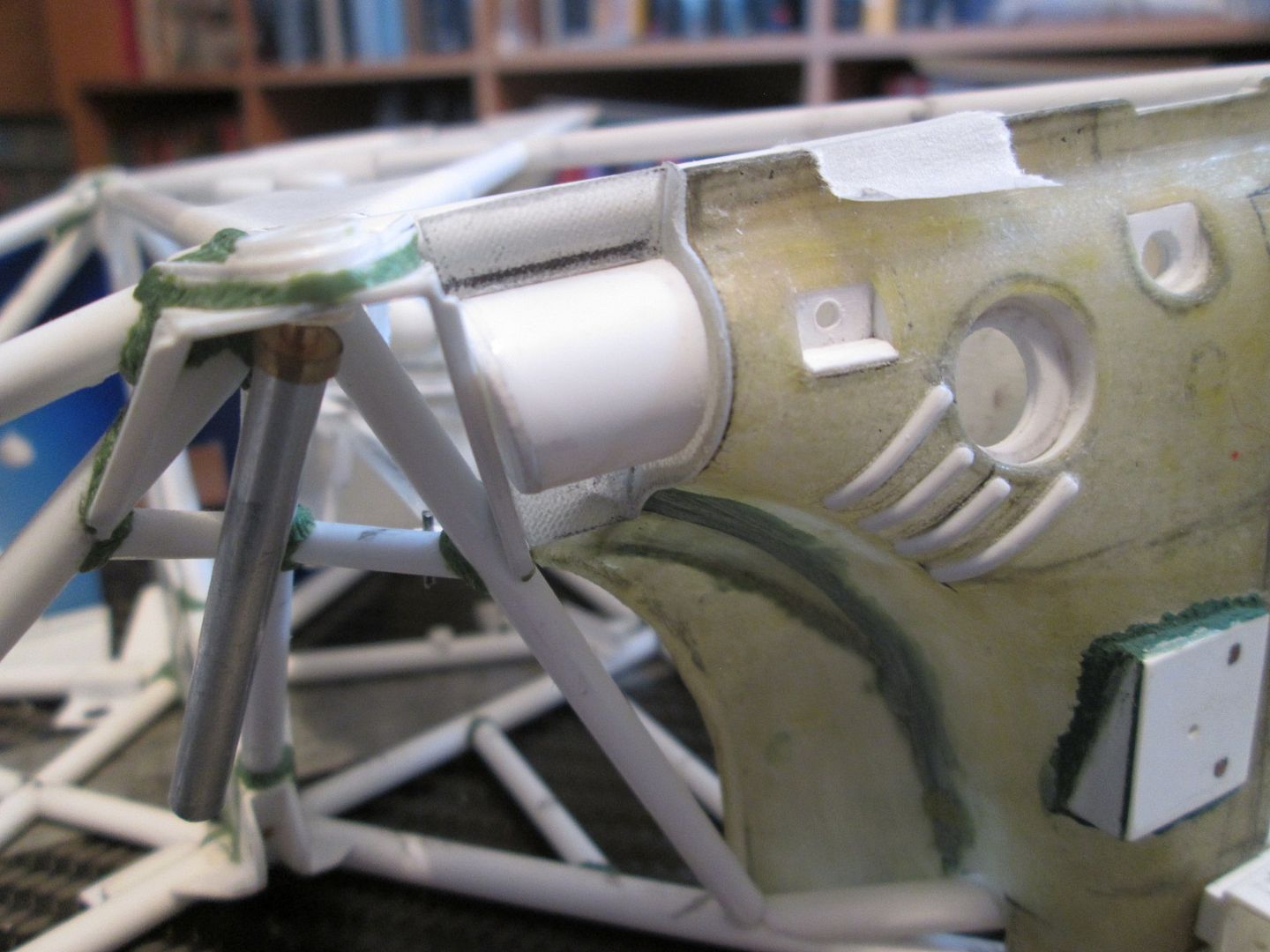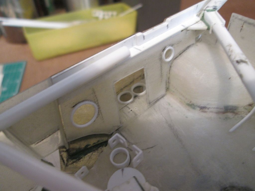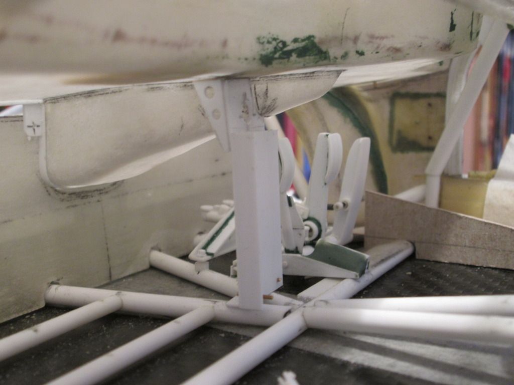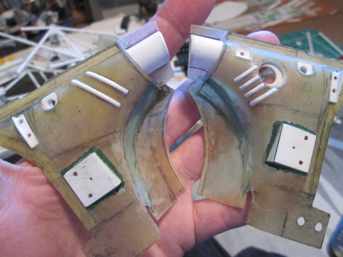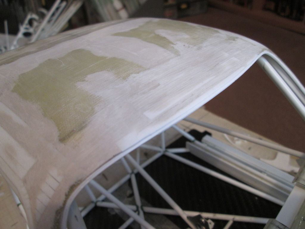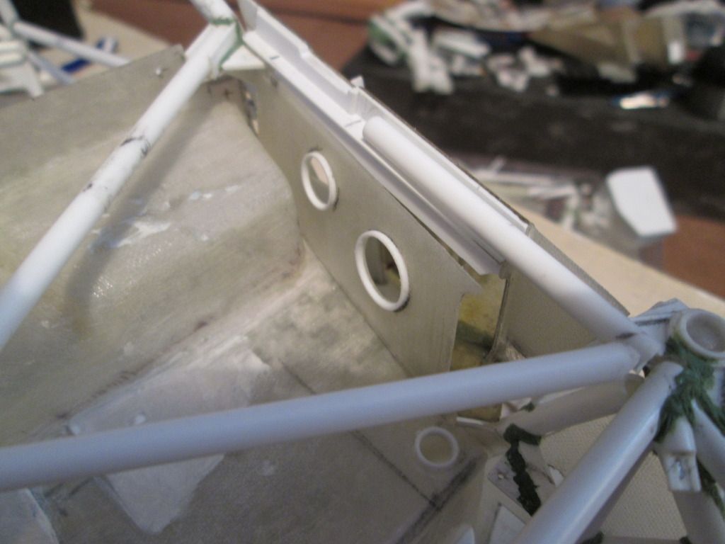 Slowly moving towards the time when I can start fixing some of this stuff together. I'm just trying to do as much as I can before that point, as there's bound to be something I forget to do which instantly becomes twice as difficult when the floor is attached! First up, here's the main inner sides panels for the nosebox in an early stage: ![]() I'd made the cardboard patterns for these ages ago, but now was the time to cut them from sheet fibreglass. The cut-outs around the suspension strut top mount were tricky, but I've been able to do them without being too gappy. This particular lay-up came out at 0.55mm thick, but it's quite flexible - the innermost section is vertical where it meets the wheelarch, but it then twists slightly as it moves forward along the nose of the chassis. The cut-outs for the wishbone and steering help it to flex, too. Here's the view from above: ![]() Since taking this photo I've opened out the holes around the leading leg of the wishbones, and made two curved sections which will blend the panel around the inside. There's also some small holes for where the two ali nose support frames will attach later. In the middle you can see the two extra brackets added to the chassis to attach to the floor - these will be covered once the fuel tank is in place. Next, I made two small internal panels which close-off the lower part of the nose of the car, behind the oil tank and fuel tank: ![]() Neither are totally accurate to the real thing, but are the result of how I made the oil tank and fuel tank months ago. These will both be painted and glued into place later. Given that I've recently been trying to work out an assembly sequence, this also has to include parts such as the water and oil pipes running around the front of the chassis. Some of these have to pass through or into some of the body panels, so have been added to the sequence. Here's the right-hand side: ![]() Here you can see how the hole in the side panel for the wishbone and steering has been opened out, with a stepped front edge to match the interior panel. The small hole at the top of the photo is where the front roll-bar will go - this will have to be modified slightly to allow for the adjuster mechanism to pass through. The bottom edge of the side panel and front bulkhead has been trimmed away so that the lower oil pipe is exposed, whereas the longer water pipe running to the intercooler comes out of the wheelarch, through a notch in the sidepanel, then through a hole in the bulkhead before attaching to the chassis. Currently this pipe is one-piece, but I might consider splitting it to make installation easier. My early thoughts on the assembly sequence concluded that the front firewall / dashboard panel would have to be fitted at the same time as the main roll-cage, as it would be impossible to add it afterwards. However, there's just too much stuff to sort out under there, and trying to do it with this panel in place would be incredibly difficult. So, I think I have the solution... ![]() I've trimmed a section from the left-hand side of the firewall - this allows me to hook the right-hand side of the panel around the roll-cage, then rotate the whole lot into place through the cockpit. The panel you can see here with the two holes will eventually camouflage the join when the extra piece of firewall is replaced. I've added some styrene strip along the bottom to provide a step to locate the base, and a length of angle along the underside of the wheelarch panel will secure the top. I've done something similar on the other side, too. The firewall is intact, but the inner panel includes a cut-out to fit around the wash-bottle mounting, and two holes for routing various oil and fuel lines through into the cockpit - you can see two more holes through the firewall behind: ![]() So, I reckon that I'll now be able to fit the wheelarch panels, main roll-cage, front bulkhead and the nose side panels, then drop the firewall on top to complete the structure. This should allow me to do most of the footwell detailing from above with relatively easy access. I can also detail the underside of the firewall before it goes in (wiring, electrical boxes, etc), which should help. Making progress... SB |