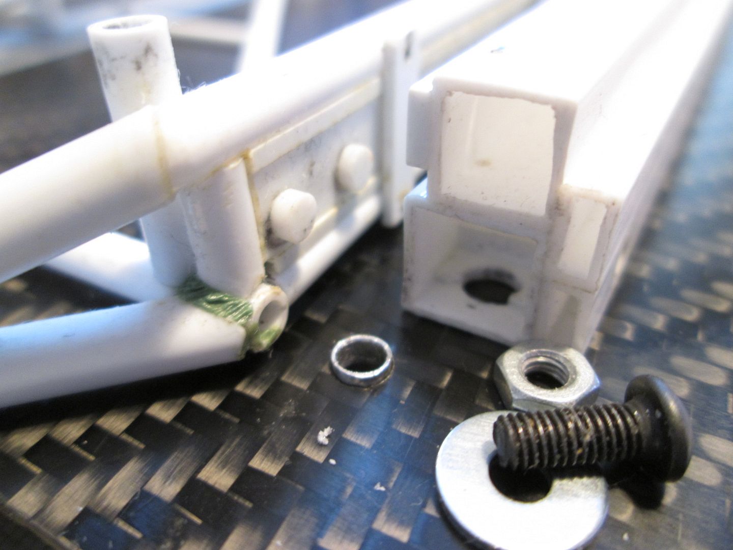 Lots going on during the last few weeks - my main reason for not posting is that I've been jumping from one job to another and thinking 'I'll just do some more on that before I do an update...' and then going off and doing something else! However, progress is progress, and I'm now working towards being able to permanently fix the tube-frame chassis to the carbon floor. This means doing lots of little jobs now which will be much harder if I leave them until later. First up tonight, here's an updated shot of one of the front roll-cage mounting points: ![]() The styrene core now has a thin fibreglass top and side panel, and there's a fake 'foot plate' which will slide into place on final assembly. The cover for the throttle cable now has a top panel too, leaving a thin slot at the rear edge where the cable and pipework will exit. Next, I decided to use the 'Sandy Paste' on the intercooler housings: ![]() As with the test pieces it took three or four applications to get a consistent finish, but I'm pleased with the result. I had to remove the original hex-nut detailing from the six mounting flanges, as the paste needed a little cleaning-up and this was the easiest way. No problem - it also meant I could use some more of the 'Wave Option' details instead. The one in the foreground has been given a basecoat of Citadel 'Chaos Black' followed by a light drybrush with 'Scorched Brown' and 'Boltgun Metal' to make the texture stand out. Here they are on the engine: ![]() I gave the bicarb method a try, though - it did give a slight texture, but I didn't feel it would show up on the model, even with painting. It could have a use elsewhere, of course, so I'll file it away for the future! Next, some work on the carbon floor. It was always my intention to use the box-section outer sills as the main method of attaching the chassis to the floor. The question is: how? Well, there'll obviously be some glue involved eventually, but in the meantime I wanted something that was removable and repeatable, so that meant using some bolts. To start with I drilled four 4mm holes through the floor which lined up with the ends of the outer sills (so I could access the nuts). Short pieces of 4mm ali tube would fit through these holes and act as dowels to locate the parts together. Finally, some short M3 buttonhead screws and plain nuts would clamp the whole lot together: ![]() I've also added a pair of small brackets in the front of the chassis frame which give me two more fixing screws - these will be hidden when the fuel tank is dropped into place later. Finally, I've been spending some time detailing the front inner wheelarch panels, as these need to be fitted between the main chassis and the outer sills. Here's the left-hand panel: ![]() You can see that I've added three recessed holes of varying shapes and sizes (the largest being where the fuel filler neck would be on the original 911 road car), and some rib detailing made from half-round strip. There's still a few more holes, etc, to add but these are the main features; the right-hand side has received similar attention. The short section at the front end closes off the gap between the strut top mounting and the main wheelarch. On the real car this appears to be a fibreglass extension, but I've made mine as fabricated parts. The white styrene tube will be greenstuffed later to blend in with the main fibreglass section. I might have been able to make life easier by moulding these panels as one piece right from the start, rather than cutting them short, but it hasn't been difficult doing it this way: ![]() ![]() So, this just leaves the side panels which will close off the nose of the chassis. I started making some cardboard patterns for these a while ago, so I'll return to those and see what I can do. Then I need to do some tests to check the assembly sequence: if I fit and glue A, B, C and D, can I still fit E, and still be able to paint B and D afterwards?! That's why everything takes so much time, and why I've not been in a hurry to paint anything. I can't avoid it forever, though, so that's why I need to get the chassis fixed to the floor during the next few weeks - this will open up several more jobs I can do, and start the assembly process. All the best, SB |