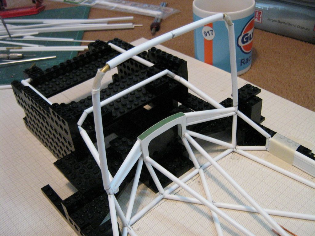 Before I finally glued the rear frame together, I took the decision to reduce the height slightly - by about 3.5mm. The angles of some of the tubes just weren't matching up with what I could see in the photos, and it was going to annoy me if I didn't do something about it! So, I trimmed the lower verticals beneath the gearbox frame, re-drilled the holes in the outer corner verticals, and shortened the long forward tubes through the cockpit: ![]() Next job was to attach the reinforced sills and the diagonals to connect these to the rear frame, and add the extra upper tubes: ![]() ![]() The extra upper tubes aren't pinned at either end, but there's a wedge of 1/4" x 1/8" section to provide a firm anchor to the lower tubes (plus plenty of glue, of course). Later there will either be a thin skin of styrene sheet wrapped over both tubes, or a layer of greenstuff to achieve a similar effect. The main reason for not trying to pin these was that I still have other parts of the frame and suspension pick-ups to add, and I wanted to be sure I wouldn't compromise their pinning. ![]() In this shot you can see I've added the sills and also bent a new rear roll-hoop. I've used the fire-extinguisher piping again as it's just so good for this job - the internal diameter is just right for reinforcing the joints, too. The outer diameter is 6mm, so I don't think it is particularly out-of-scale, either. Once all the tubes are in place I'll use some greenstuff the soften the transition from one tube spec to the other. I won't glue this hoop just yet, but I need it there while I'm working on the engine bay... In these last two photos I've started on the rear frame, re-using the lego support from before. I remembered to reduce the height, too, as the mk1 frame was actually too high in this area! The first three tubes I've cut are all in the larger 4.8mm styrene, rather than the 4mm used elsewhere. The shorter piece across the back of the frame is reinforced with a length of 1/8" ali tube, with 3/32" tubes inside this to pin it all together. Once the engine and gearbox are fitted (oh...maybe sometime next year?!) there will be a lot of weight hanging off this frame... ![]() ![]() I've started working on the angled tubes to connect the two parts of the frame together, as you can see above. These are never easy as there's all sorts of angled joints going on at each end - lots of filing, checking, and re-checking. It'll take a while to get them all done, but I'm not on a deadline. So, that's where I am now. I'm hoping to make some good progress this week, especially as there's a three-day weekend coming up. There's the Spa WEC race to listen to on Saturday, and the Snetterton 6 hours on Sunday, so plenty of motorsport to provide the background music to my modelling. Scarily, we're only now seven weeks from Le Mans again - but I don't think I'll be taking my modelling with me this year! Have a good week, SB |