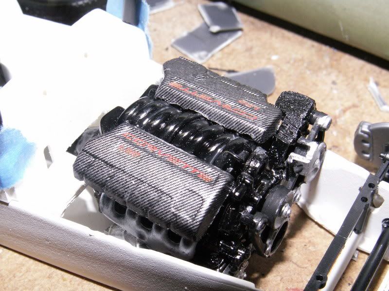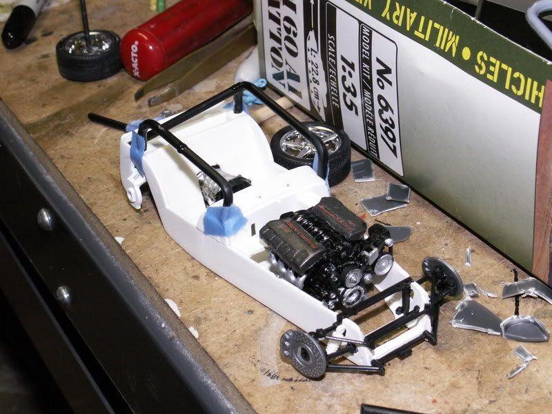 Rollcage is done, all exterior parts have been hit with flat black in anticipation of color later tonight. Suspension bits have been hand painted... lots of chrome. I'll add the few remaining colors later tonight, as well as painting the seat tan. Exterior color will take a little while, I'm afraid, as I'm gonna build up the color little by little to get the deepest effect that I can.