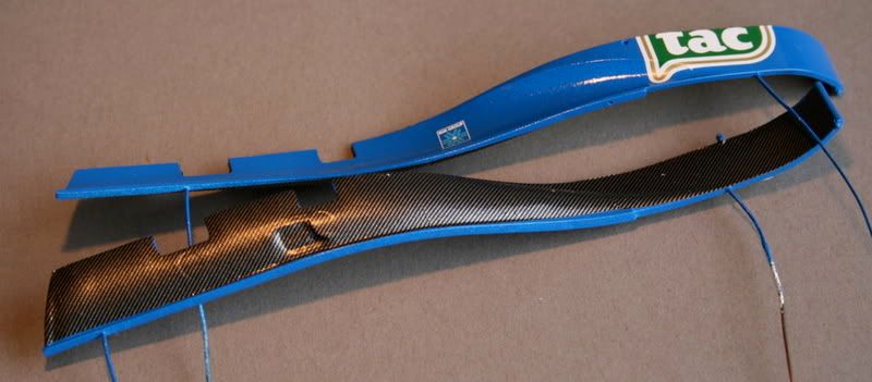Quick update and a few photos. Basically I have done some more decalling, CF work and a bit of wiring and plumbing: The first image shows the side elements of the rear undertray. On the real car, they are one part with the undertray. I considered attaching them to the undertry before painting but decided that would be silly. Once the decals have dried properly I will clear over these pieces and then apply Bare Metal Foil (BMF) to the insides as per the reference pictures. This is to protect the CF from the exhaust heat. ![]() I have started working on the CF on the monocoque around the cockpit. The CF alignment is as per the ref pics and looks wrong if you ask me. Normally CF is applied at an angle, but all the reference pictures show the CF is perpendicular. The work isn't finished yet but should should get the idea. ![]() ![]() Here is the "Red E" in place on the rear cowling. If you look at the reference pictures, you will see what I mean about the E being out of scale (too bold) ![]() Also, here are the white lines I added from the Tamiya decal set. They are too wide for scale, and they are starting to crinkle and crumple, so I retract my early comment about being tempted to use them for the whole pinstriping job. ![]() Finally, here are some shots of the engine. I have added wire and hose and temperature stickers. The hose looks too thick but it is very thick on the reference pictures. I would have liked to have been able to recreate the blue terminals on the hose but was at a loss how to. If you know of any aftermarket parts that replicate that, let me know for future reference... or if you have an idea how to scrath them, let me know. ![]() ![]() All the best, BillyPee |