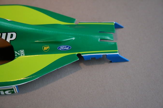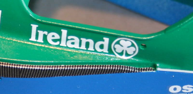 The Studio27 decal of the red capital E in a white circle with a red edge has an overly bold letter E when compared to the reference pictures (I also noticed that the Ireland decal on the side of the cockpit is too bold too. I have applied the Tamiya white lines on the rear cowling now (as I can only assume the Studio 27 decals omit these). The Tamiya ones are slightly thicker and whiter and are actually very good. They are perhaps a little too thick for scale, but they do a much better job of hiding any imperfections in your masking of the blue/green border. Given the opportunity over, I would use the Tamiya white lines (on sheet B) unless I was very happy with my masking/paint job. Hope that helps, BillyPee |