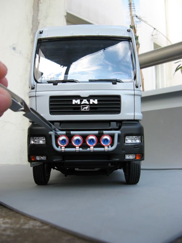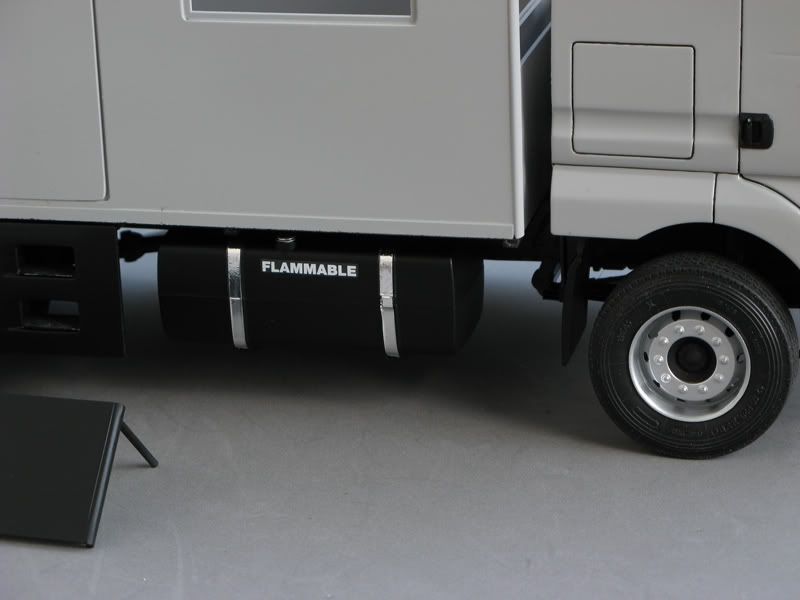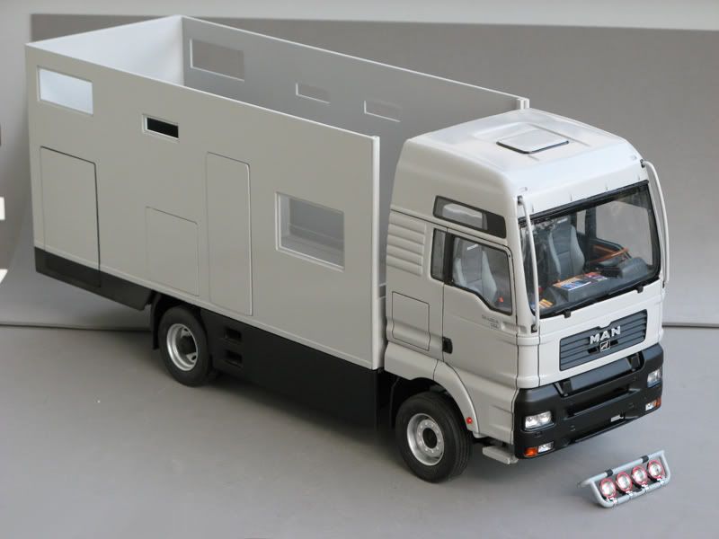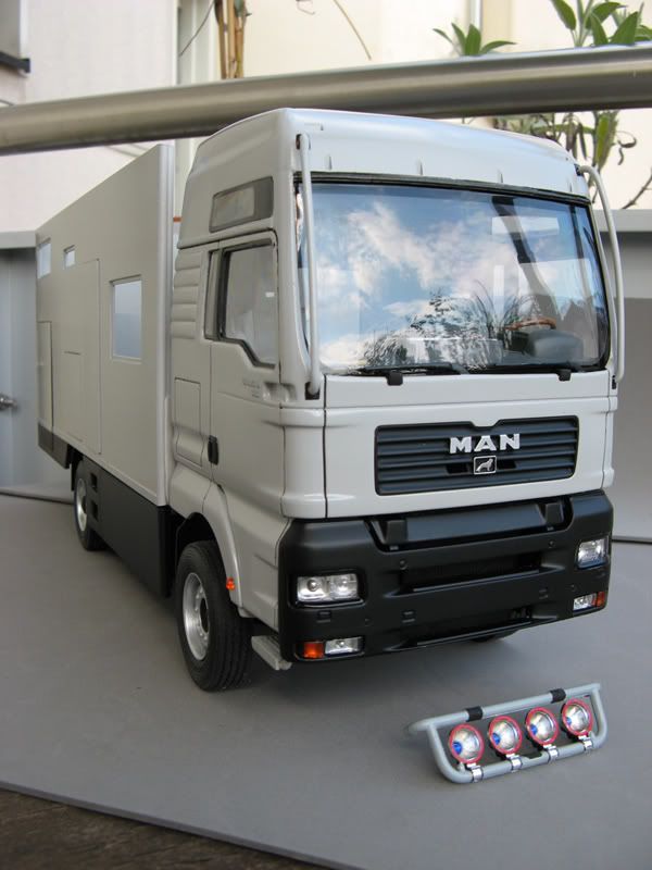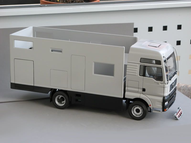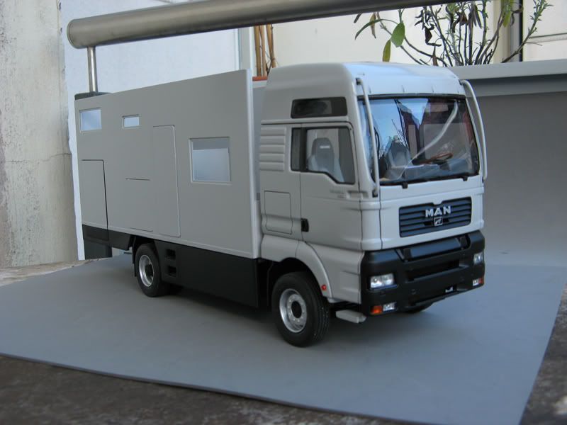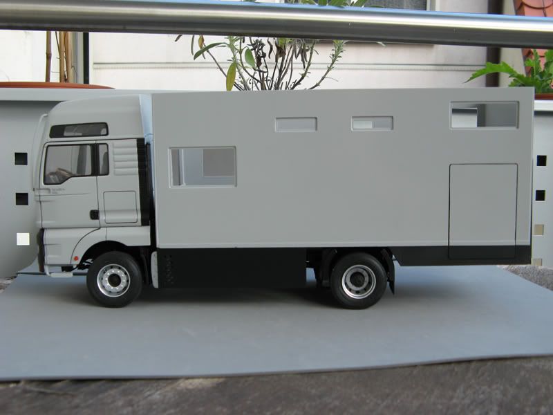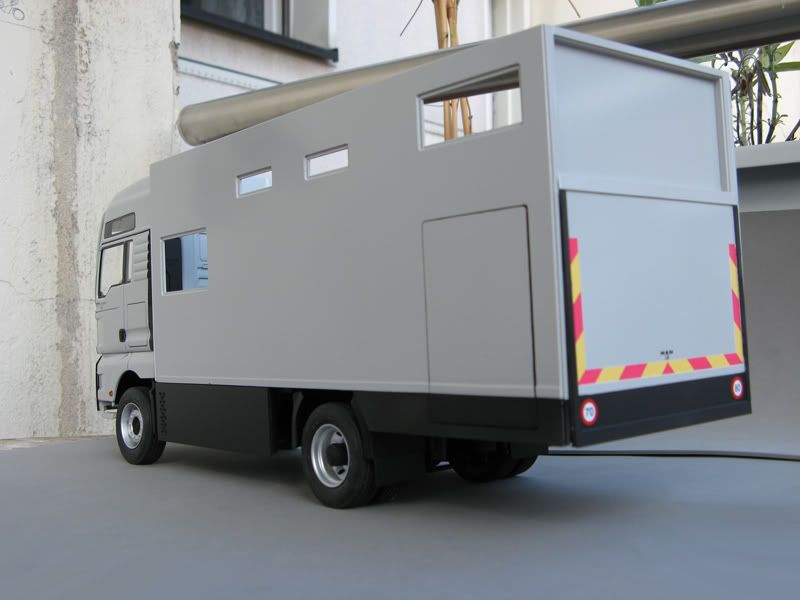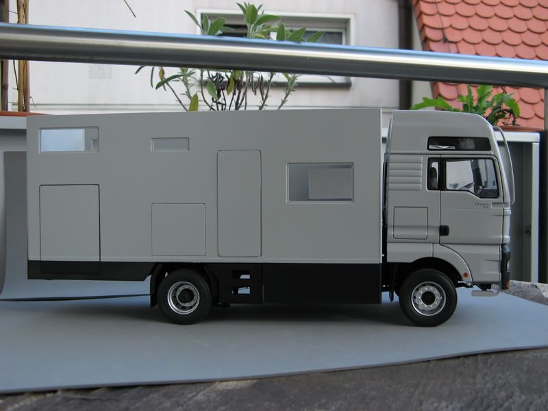 ...yeah, I do! But I had no other choice due to many reasons: - he wants to be able to stand upright in the garage - he didn't want a truck with three axles - the motorcycle has to fit in lengthwise - the sleeping area is atop the garage (you need some headroom there, too) - and....maximum height is 4000mm by European laws. Initially it was planned to be 30mm/720mm (in scale/real) shorter... MAN says this is the maximum rear overhang for this chassis. I know it looks rather silly, but there's nothing I can do about it ![]() Next project of such kind will be a UNIMOG (with almost no overhang at all). Until then... |