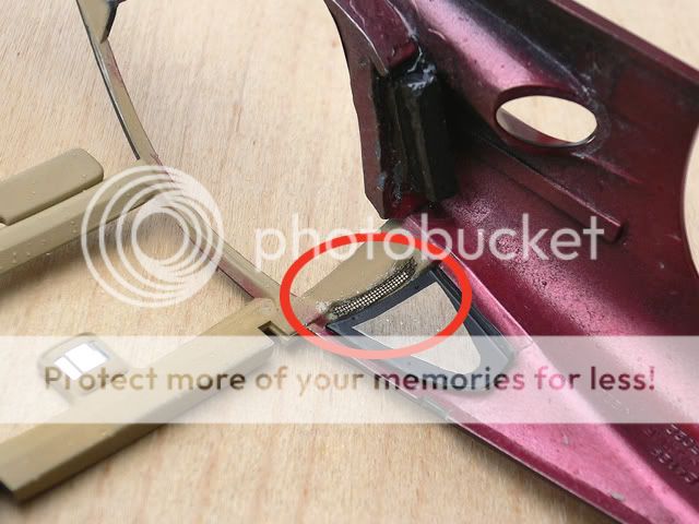 Let's continue: Here is the mounting of gas-lift I mentioned before: ![]() There are air vent holes behind door windows. They have meshes. I decided to reflect these feature on the model: ![]() This how it looks like inside: ![]() ....and outside: ![]() In the doorway of a real car we have nameplate and rubber covers. ![]() As we have two couples of nameplate on decal sheet, I decided to use the second pair. I also used adhesive rubber band and mirror-like “Oracle” tape: ![]() Doors: