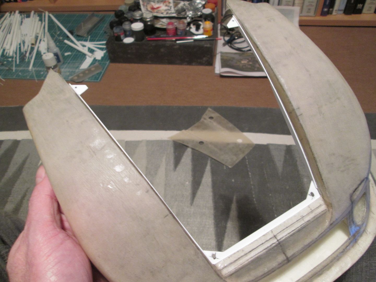 I airbrushed the whole steering wheel with a couple of coats of Tamiya semi-gloss black, then toned it all down by carefully drybrushing the centre with Citadel 'Chaos Black' and some Tamiya 'Rubber Black' for the rim. Note also the column stalks fitted behind. This is all now ready for final fitting. ![]() Next, a bit more on the nose section. I mentioned last time that I'd added some styrene around the inside - you can see it better here: ![]() The two small triangular plates in the upper corners also have magnets underneath and will eventually fit over a couple of locating pins on the bodyshell. The seatbelts took the best part of a week to make. I had the various sizes of black ribbon from making the 908, so just had to stitch it all together with the various brackets, etc: ![]() ![]() The main problem with the ribbon is that once cut, the edges tend to fray apart. In the past I've used CA glue to seal them, but this can result in them becoming stiff. So, all the ends have to be folded back and stitched together. No major wounds or physical injuries during the stitching, I'm pleased to say, although it took a bit of force to shove the needle through three layers when assembling the lap-belts: ![]() Last thing for tonight - headlights! So, the headlight bowls were laid-up in fibreglass a few weeks ago, removed from the moulds and trimmed up. Next job was to line the inside with aluminium foil to create a bit of 'shine' - I used one of the male patterns to press the foil into the bowl (without tearing) and then repeated the procedure when gluing the foil in place: ![]() I'd already planned to use a length of 20m diameter clear acrylic rod as the starting point for the lenses, but once cut it needed a lot of work with various grades of paper to clean up - I even used a little bit of toothpaste as a polishing compound! You can see by the reflection that I've chamfered around the edges to get some shape into the lens, too. Of course, having made the bowl, and the lens, I really had to make the bulbs too. These are 4mm clear rod, a little shaping on each end, with two 0.5mm holes drilled into one end with fine copper wires inserted as filaments. A collar of styrene and aluminium tube around the base allows a 0.5mm pin to be fixed through the whole lot which in turn allows the bulb to be fixed into the bowl. ![]() ![]() I glued the lens to the styrene ring with CA glue (having tried a test-piece first to make sure it didn't react. The styrene collar has then been filed and sanded down to a minimal diameter: ![]() Now, two things to note here. Some of you will say that I have not put any pattern on the lenses - this is true. The factory car has this style of headlight, but the Freisinger car appears to have plain lenses. I also couldn't think of a good way to create the lens pattern accurately without risking damage to the part! Having glued these together last night, they have become somewhat cloudy. The photos aren't great, I know, but they look better in reality. I'm wondering if the CA glue fumes trapped inside the bowl have caused this - I might try drilling a small 0.5mm hole behind the lens as a breather. Overall, I'm pleased with the result. I just need to make some small adjuster pieces which will be positioned around the outside, and make sure the whole lot fits inside the pod in the bodywork. There's also a couple of small indicator lights and marker lights to do. That's it for tonight. I plan to do another update between now and Christmas, and probably another one at the end of the year - it'll depend on how much progress I can make! Still plenty to do... SB |