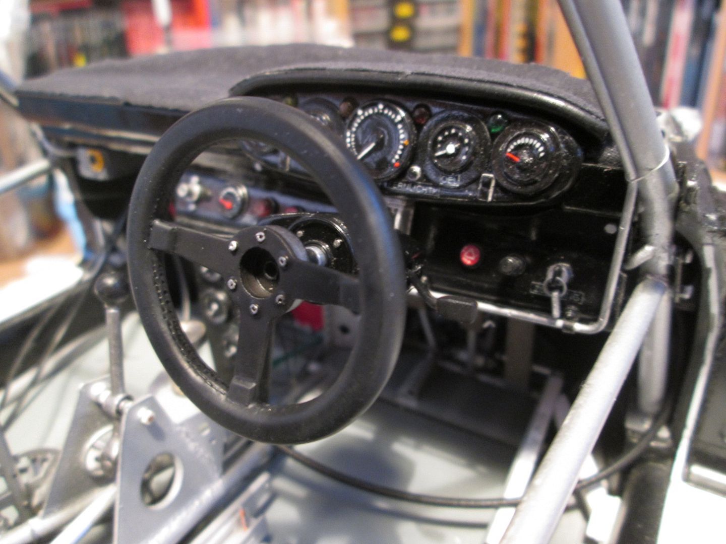 Although I spent a fair bit of time modelling during the Christmas holidays, I wasn't able to make a big leap forwards - mainly because I'm still being careful about what gets glued in and when! Most of what I've been doing has been preparation for either fitting the fuel tank, etc, into the nose, or for getting the cockpit relatively complete before the roof goes on. First up, having added a few extra details to the headlight surrounds, I made the two small indicator lights and marker lights: ![]() ![]() Very fiddly to make, but I think they'll look fine once the bodywork is painted. For now they're just pinned in place. For the indicators I cut each one from a thin disc of the 15mm clear acrylic rod, then rounded-off the ends with a file. A couple of coats of Tamiya clear orange, and job done. The clear marker lights were cut from the remains of the disc but needed a bit more filing to shape. The backing plates are strip styrene, with 'Wave Option' rivet detailing. One thing I definitely wanted to do during the holidays was to sort out some of the decals required for a few of the electrical parts. I spent a couple of hours trawling online for suitable logos, etc, then spent a bit of time cleaning them up and checking the sizes. The end result was half a sheet of logos, most of which will hopefully not be required... ![]() Here's the starter motor, ignition boxes and coil: ![]() ...and the battery: ![]() I'm particularly pleased with the battery - although it's buried down in the nose of the car, the decals stop it looking like just a black box. While I was at it, I sorted the wiring for the fuel pump, ready for installation. The coil needed a bit of work to finish the top detailing, and the ali mounting strap (not shown) has been primed and re-painted. Each part has been re-varnished afterwards to give the decals extra protection. Most of the rest of the work has been in the cockpit. The last couple of photos hopefully give a feel of what I've been doing: ![]() ![]() The wiring running down the left-hand side of the cockpit from the dashboard has been matched up with the appropriate pieces coming from the engine bay, with a length of ali tube used as protective conduit. This might be changed. I've drilled some extra holes through the rear firewall to pass a few of the cables through, rather than forcing everything through the holes for the water pipes. The fuel lines down the right-hand side have been strapped together and are ready to be fixed in place. There's also a thin grey wire there which will be used for the air-jack plumbing - I've also made the fittings for the top of each jack. I've made four pins which will be used to fix the seat frame to the mounting channels, and re-made the handle which connects the two adjusters each side. The clutch line and two throttle cables (one spare!) have been fitted and wired into place around the chassis tubes. Before I fit the seat to the frame, and the frame to the mounting channels, I've added the shoulder straps and crotch straps - the lap straps will be threaded through the seat before final assembly. What else? The four door hinges have been fitted, glued, pinned and detailed with hex nuts. The gear lever is now glued in, although it is still free to move so I can connect it to the gearbox. At the front, I've played around with the colouring of the oil tank a little to get away from the 'flat aluminium' finish, and added a small bit of detailing to the fuel collector tank as the level sender. I've made some extra bits of wiring for the three smaller fuel pumps, and started assembling the wash-bottle pump. As usual, it's at this point that I remember I don't have photos for a lot of this stuff, but you'll see it next time. So, I'm nearly at the stage where I can start fitting the various bits into the nose - getting the decals on the battery was the main obstacle here. But...do I fit the fuel tank, then the battery tray, or battery first then the fuel tank? Do I connect the wiring before or after? What about the pipework for the fuel system? Don't forget the trackrods need to be fitted into the steering rack while it's still accessible! As always, this is what soaks up so much of the time - trying to get the correct assembly sequence. We're nearly there, though... More next time. SB |