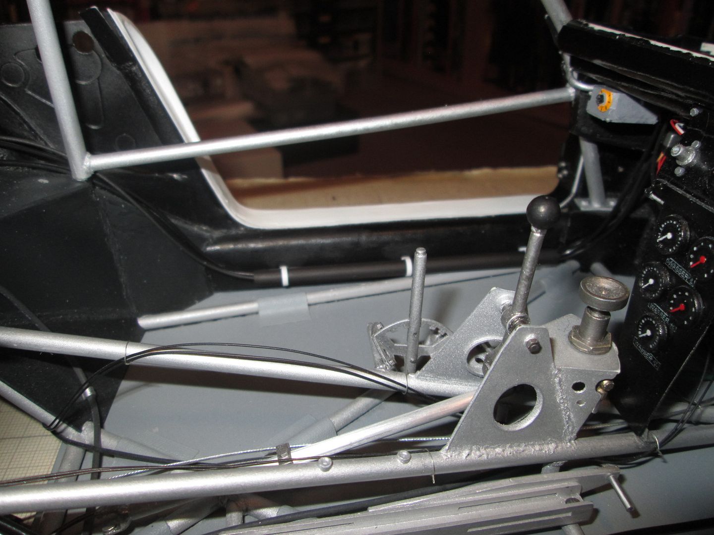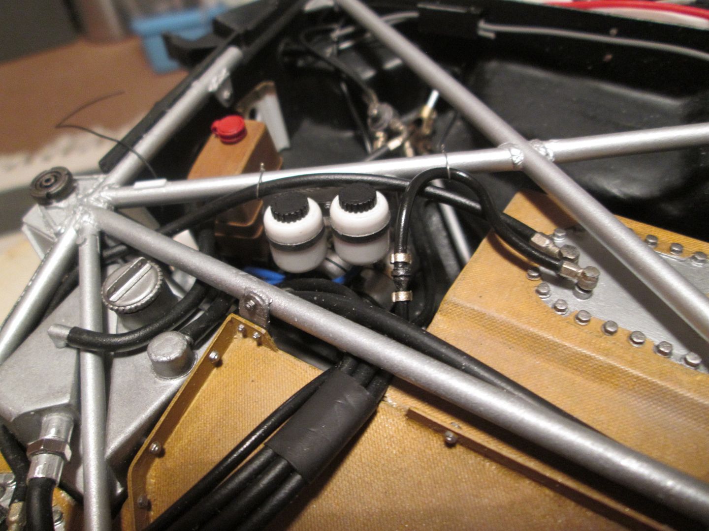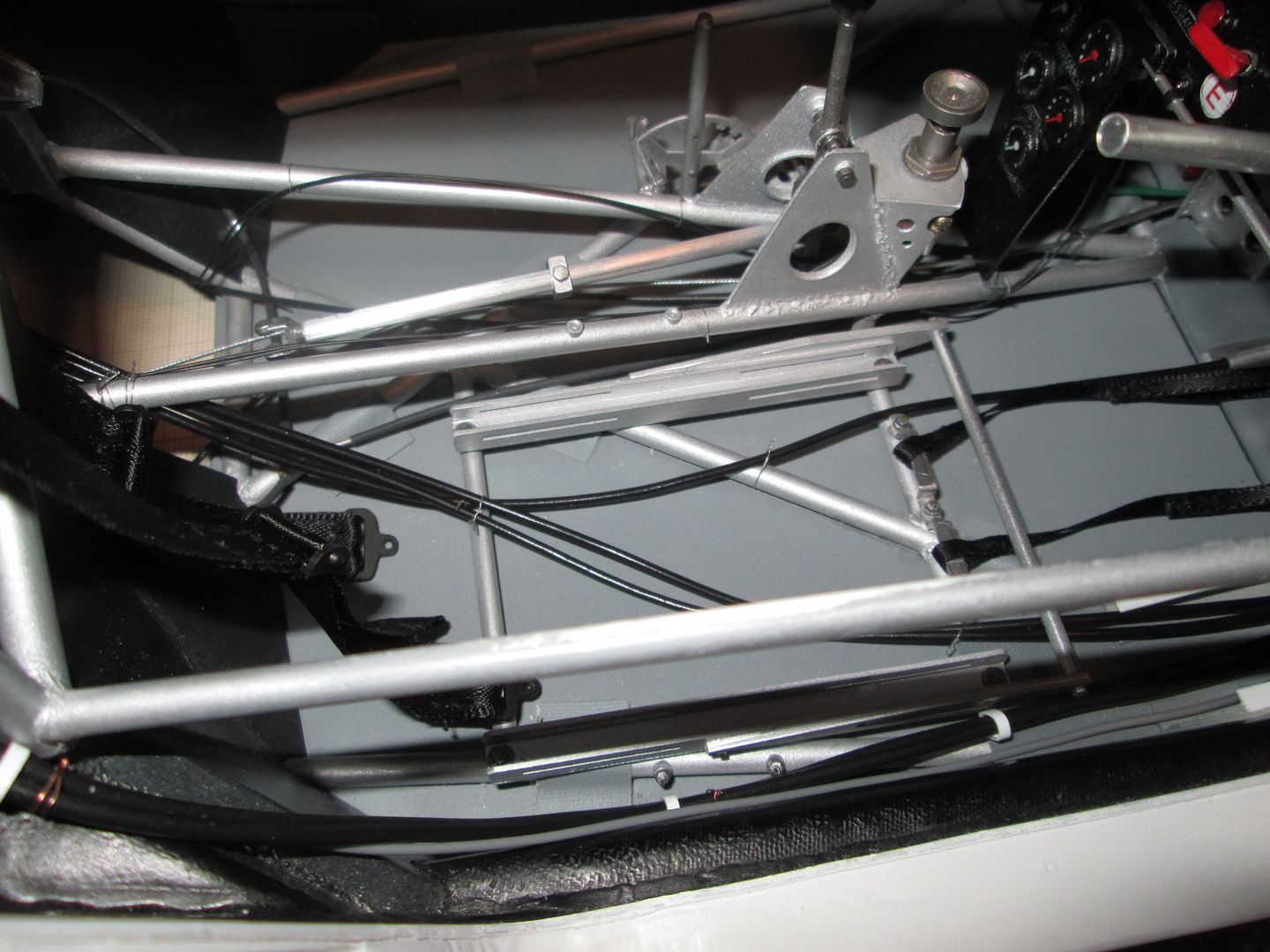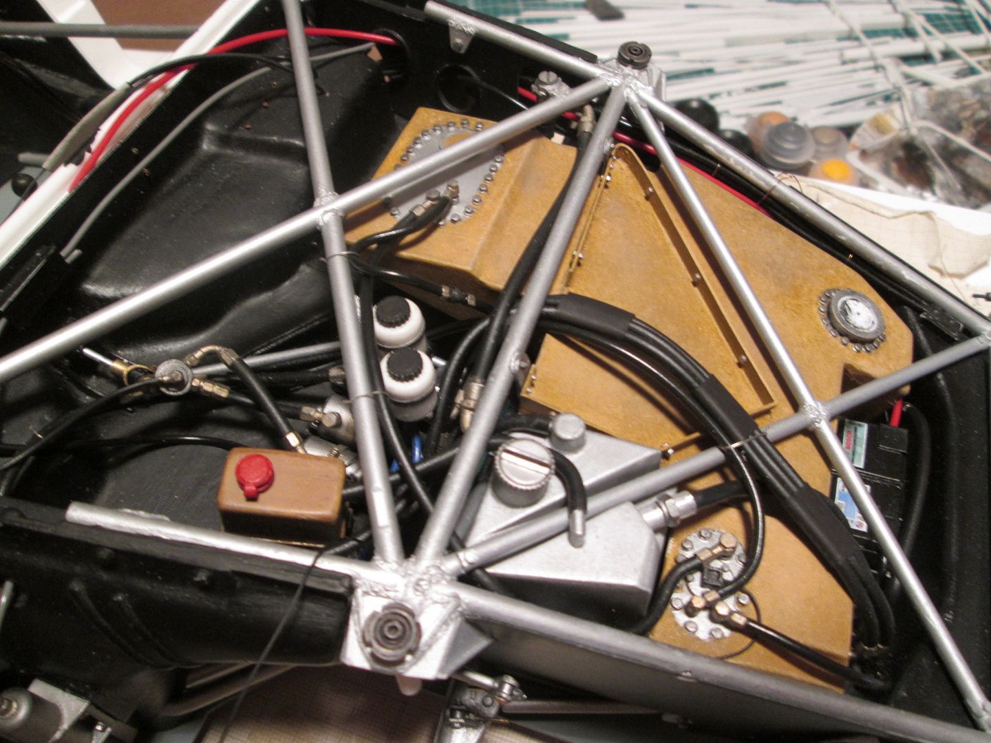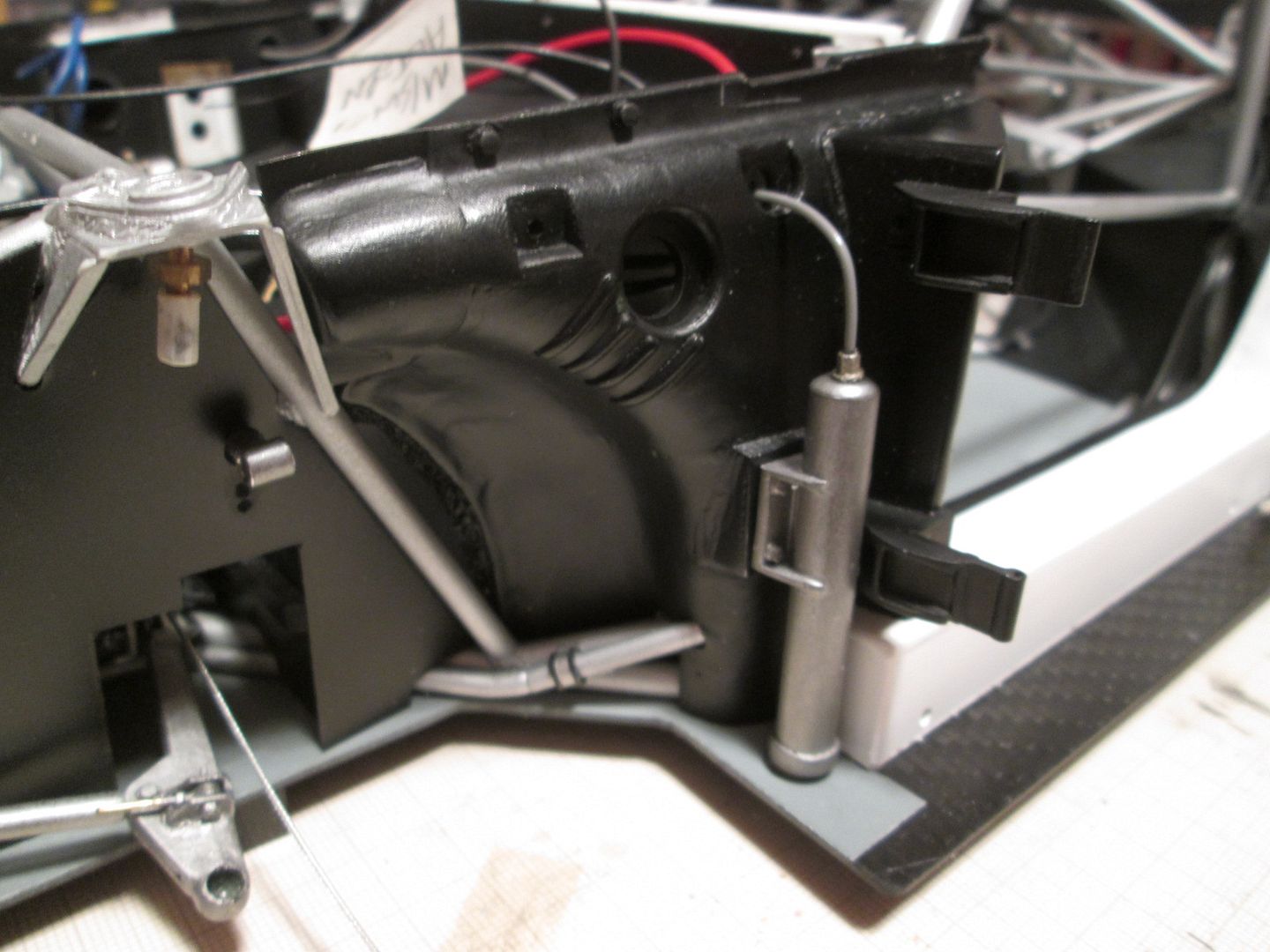 The seat shell was glued into the frame, and five small sections of styrene added at various points as reinforcements. The final touch before painting was to add some small pieces of fibreglass cloth, gluing them in place with CA (rather than resin / hardener): ![]() ![]() Just needs the mounting frame pinning to the bottom and it'll be ready to drop into place. More tidying of plumbing and wiring in the cockpit. The length of ali tube used as conduit on the left-hand side has been covered in a piece of black heat-shrink tubing, and fixed in place with three styrene straps: ![]() The fuel lines on the other side have also been fixed into place, and the cover panel to the right of the pedals has also been trimmed and fitted: ![]() I'm sure I'll find a few more wires to add here and there, but these can be tucked in and around the main ones already fitted. On both sides the chassis tubes running across the doorways have been touched-up with paint - you could see in a couple of photos in the last update (and others) that there was a lot of wear and tear. Not surprising, given the problems of accessing the cockpit! It's pretty much ready to fit the seat now, but I'll hold off on that job for a little while in case I think of something else to do in there! Once the seat is in I'll fix the lap-straps, then add the instrument pod and column surround - all easy enough to do. As mentioned last time, here's the left-hand front air-jack fitted, plus pipework, and the door-hinges: ![]() I'm now back in the nose of the car - after spending a bit of time checking the assembly sequence (yes, the steering rack bar and trackrods can be fitted later) I added the battery / fuel pump unit (with wiring), and the main part of the fuel tank: ![]() The fuel-pipe from the tank to the pump is in, and the battery has been wired-up. A bit of test-fitting proved that the upper section of the fuel tank can still be fitted, and the oil tank and fuel collector tank will squeeze into the side - some of this will happen this week. Then I can work on the upper part of the nose - wash-bottle, catch-tank, more pipework - before adding the top X-frames. It's quite possible that by the end of this month the front end will be looking fairly complete... Have a good week, SB |