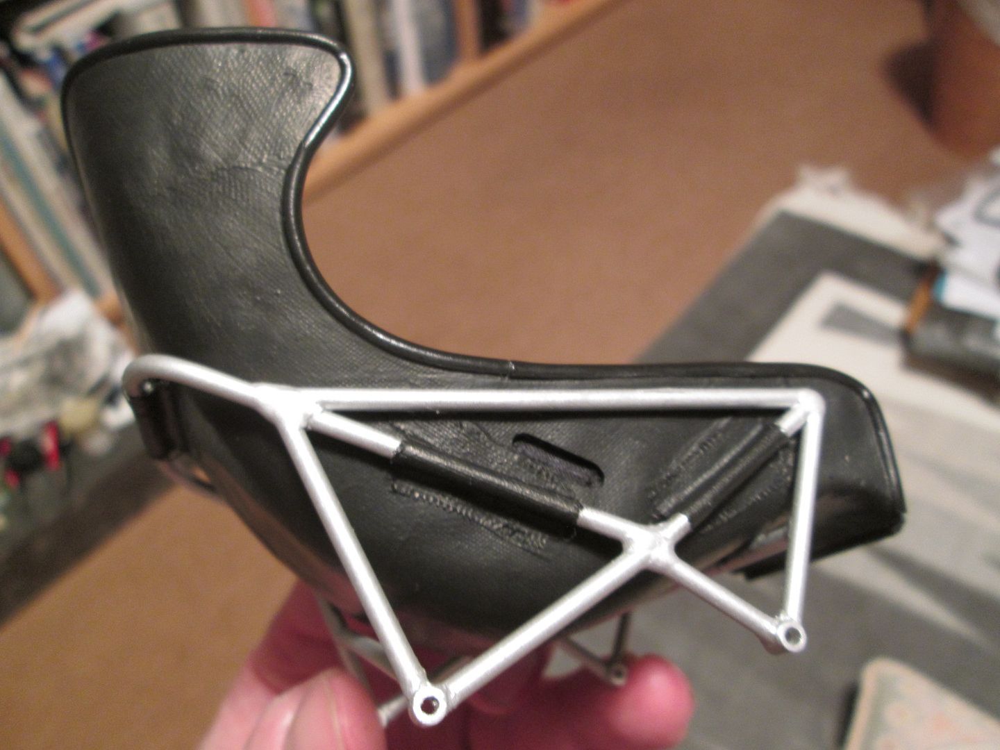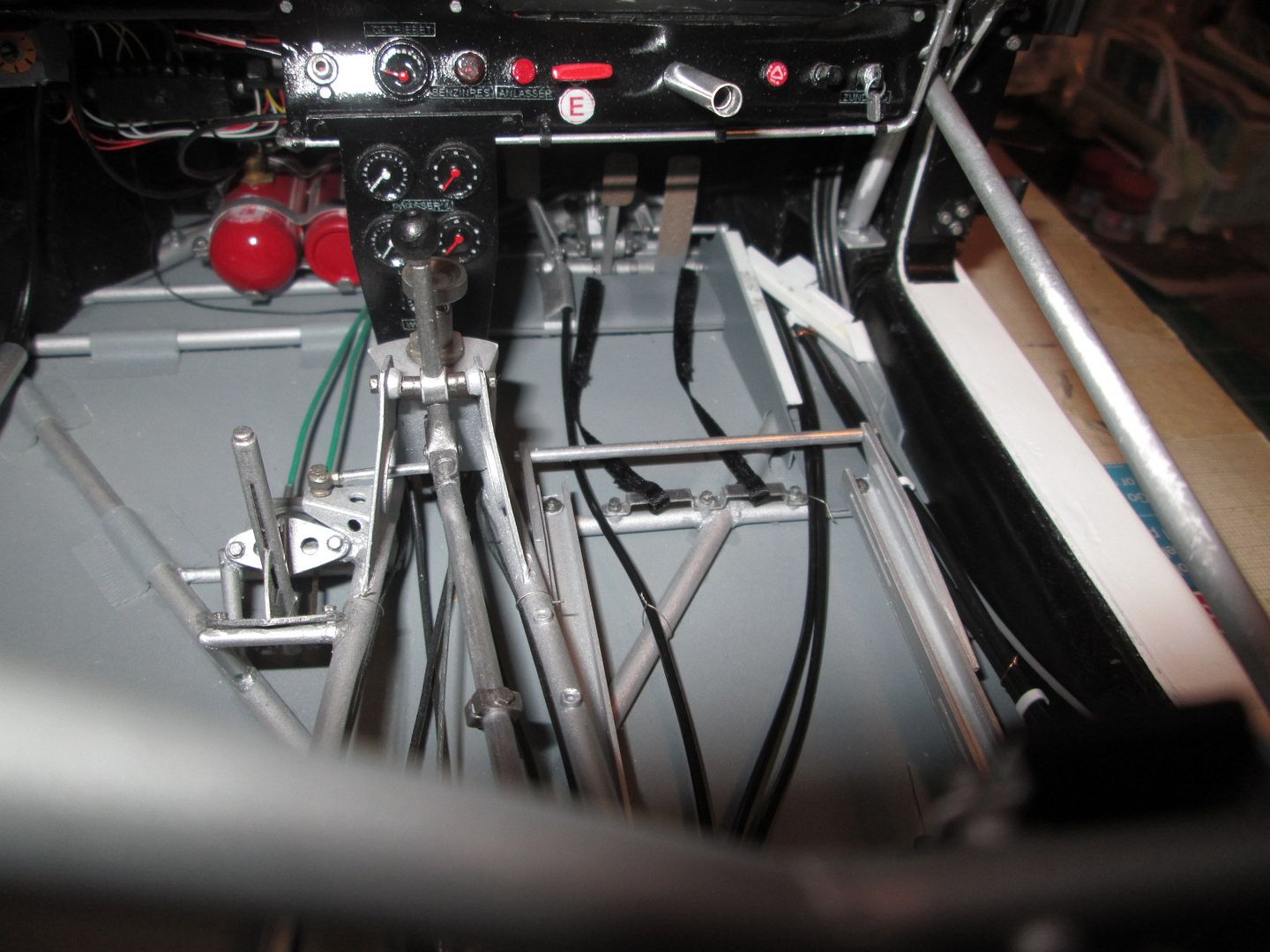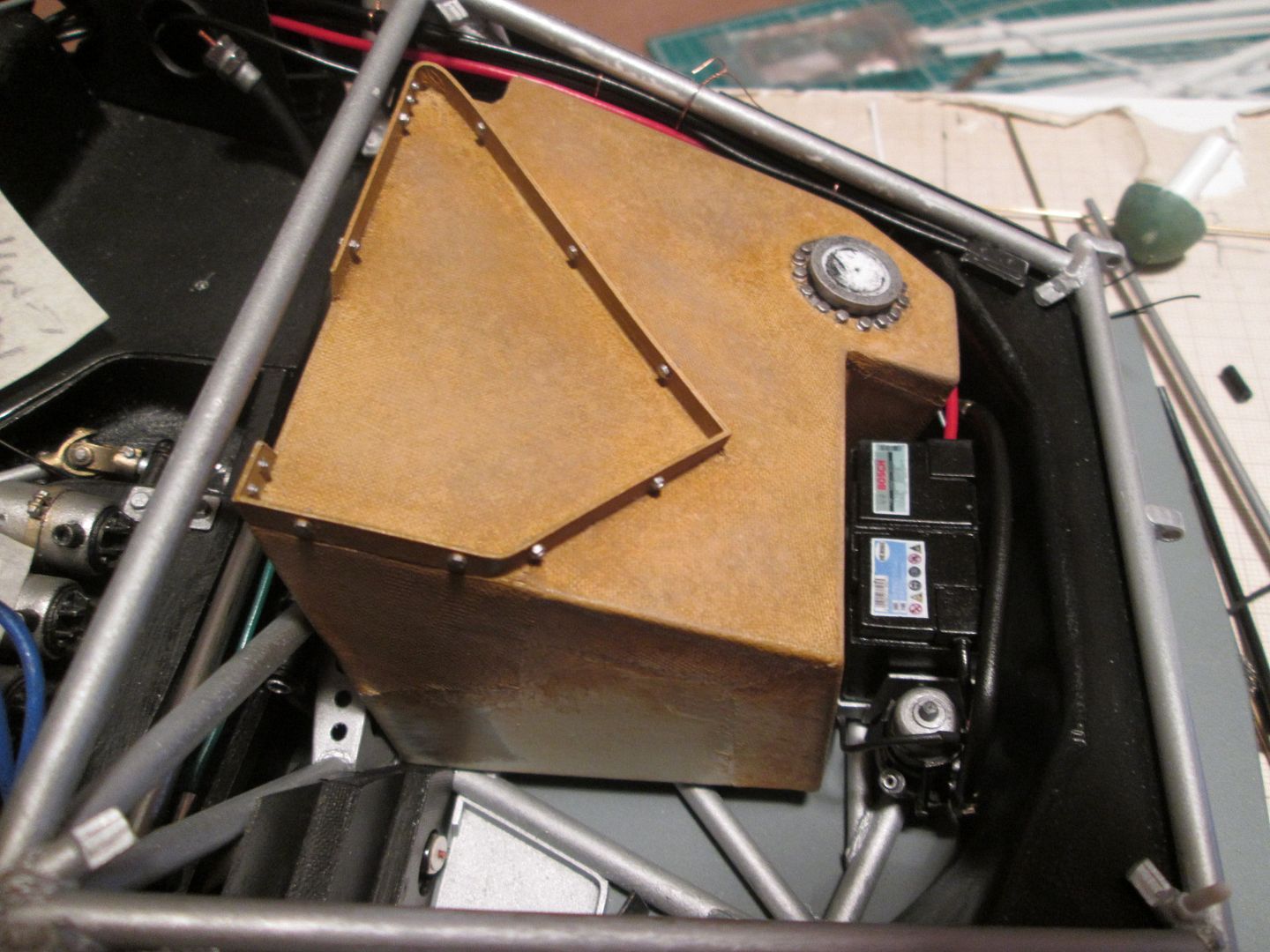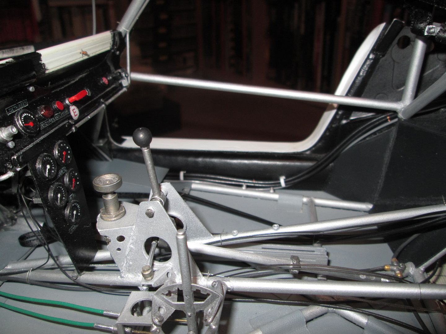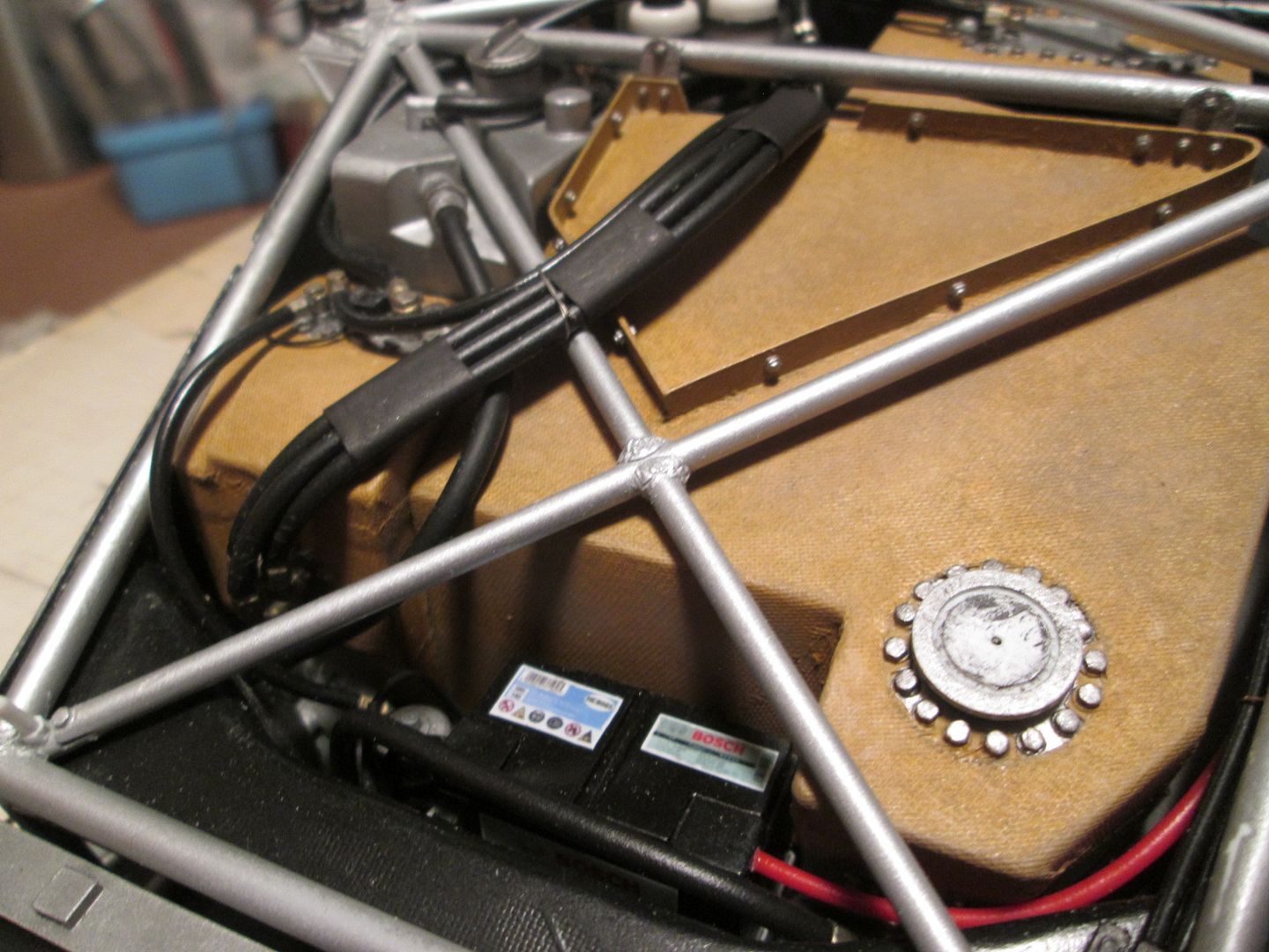 The seat shell was glued into the frame, and five small sections of styrene added at various points as reinforcements. The final touch before painting was to add some small pieces of fibreglass cloth, gluing them in place with CA (rather than resin / hardener): ![]() ![]() Just needs the mounting frame pinning to the bottom and it'll be ready to drop into place. More tidying of plumbing and wiring in the cockpit. The length of ali tube used as conduit on the left-hand side has been covered in a piece of black heat-shrink tubing, and fixed in place with three styrene straps: ![]() The fuel lines on the other side have also been fixed into place, and the cover panel to the right of the pedals has also been trimmed and fitted: ![]() I'm sure I'll find a few more wires to add here and there, but these can be tucked in and around the main ones already fitted. On both sides the chassis tubes running across the doorways have been touched-up with paint - you could see in a couple of photos in the last update (and others) that there was a lot of wear and tear. Not surprising, given the problems of accessing the cockpit! It's pretty much ready to fit the seat now, but I'll hold off on that job for a little while in case I think of something else to do in there! Once the seat is in I'll fix the lap-straps, then add the instrument pod and column surround - all easy enough to do. As mentioned last time, here's the left-hand front air-jack fitted, plus pipework, and the door-hinges: ![]() I'm now back in the nose of the car - after spending a bit of time checking the assembly sequence (yes, the steering rack bar and trackrods can be fitted later) I added the battery / fuel pump unit (with wiring), and the main part of the fuel tank: ![]() The fuel-pipe from the tank to the pump is in, and the battery has been wired-up. A bit of test-fitting proved that the upper section of the fuel tank can still be fitted, and the oil tank and fuel collector tank will squeeze into the side - some of this will happen this week. Then I can work on the upper part of the nose - wash-bottle, catch-tank, more pipework - before adding the top X-frames. It's quite possible that by the end of this month the front end will be looking fairly complete... Have a good week, SB |