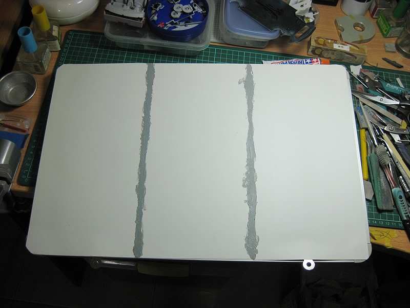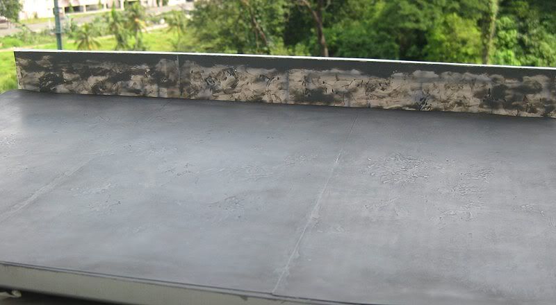 i used a cheap note board ![]() glued with 0.3mm styrene sheet, puttied the joint and brush over entire surface with diluted putty for a rough texture ![]() then i spray with tamiya acrylic grey mix with water..the cheapest and roughest way after that randomly overlap some darker grey and also black wash using sponge![]() looks ok but not very realistic as i do it in a rush ![]() |
