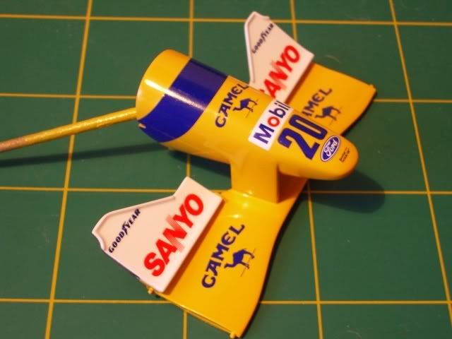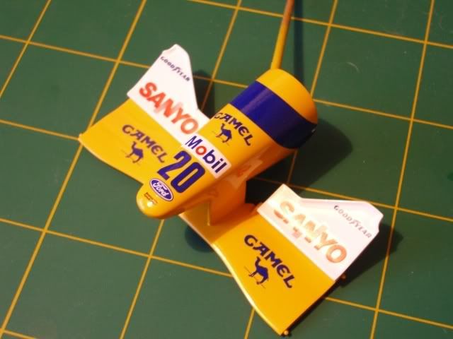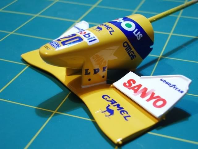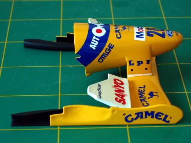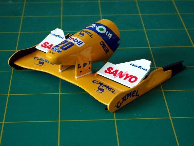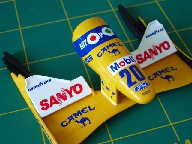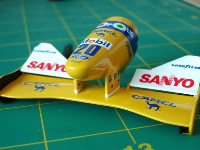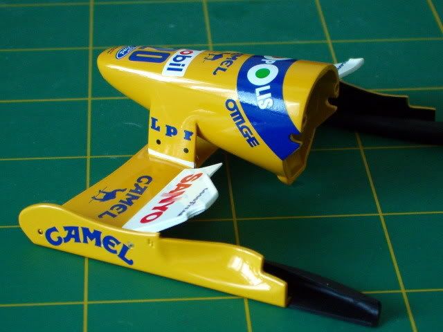 ![]() I am well on the way with the nose section.Polished up and the majority of decals applied although still some more to go on and the wing end plates still to fit.The blue decal which I was dreading applying in case it wrinkled went on perfectly.A lot to be said for the quality of Studio 27 decals. ![]() ![]() This is the left side almost finished.I thought initially that the front wing supports appeared to be too long but when the blue 'L P I' transfer,the 2 dots and the white stripe are applied it makes it appear shorter.Compare it to the other side and you'll see what I mean. ![]() All the yellow parts are now painted and drying before the green is applied.Until the next update.