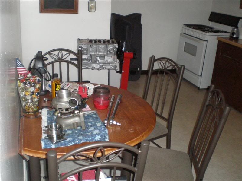 Also, what was the final torque specs on the caps? Manual says 20lbs/ft and then to 90lbs/ft. I threw out the boxes for the rods with all the papers yesterday (dumbass) so I don't know if they should be different. Was going for 90 and I can't because the stand keeps moving all over the place once I get past like 70lbs Also you can see in the pic of my kitchen the turbo is all back together except for the compressor. Still going to get that polished/painted soon and won't bolt down until on the car. Also next to it is a 2.5" v-clamp that I got off eBay for pretty cheap. Would have been cheaper to make my own, but this one is all polished and looks nice. On a side note... I've been at my apartment for over a year and my landlord has never been inside since I moved in. He said a couple months back that he would stop by one day to just make sure that everything is good and just give the place a once over. Well he called me Tuesday night asking if I he could come over because he was at my neighbors. I don't think he would mind too much with the motor being there since I'm not making a huge mess and cleaning it up, but the kitchen was TERRIBLE on Tuesday. That's why I cleaned up a lot and put everything in a home or a pile. Kinda funny that he wants to come over mid-project like that. Coincidence?