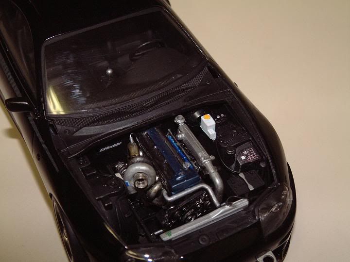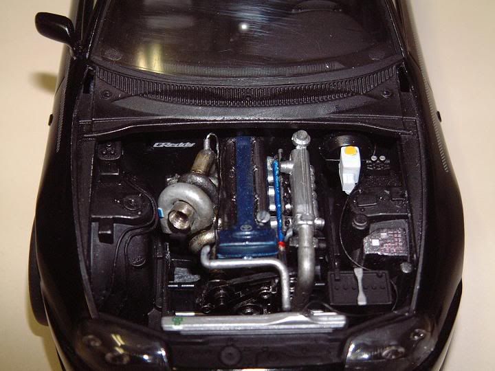 -the front is tucked the way I want, the back is a bit too high, but I kind of like it. With such a high-HP engine, it looks a little mean raised in the back. Good for the launch. -The brakes will stay that way for now. You know, I was in a year long model building slump, and just wanted to have fun with this build. I may have detailed some things more then others, but I went along and just did what I felt like, as apposed to being critical of every single area. I wanted this model to reflect a Supra that had been heavily upgraded, but maybe not completely finished. I'll probably pull the CF pinstripe's off. I can always add them back if I miss them. Thanks again for your comments and criticisms. This should be the last model I build with rattle cans. Airbrush in the works. Stay tuned, I still have to finish the engine and intercooler.