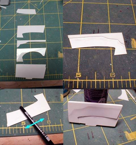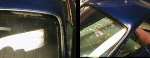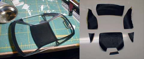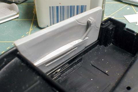 Since I have one of each 575 and 550 kit to build in the future, I'm saving the masking tape, so I can cut out another set of masking tape by using the old ones as templates. ![]() After I glued the window, a part of the glue leaked out! I don't remember when was the last time I made a blunder like this, but what has happened can't be reversed, can I? Repair work was simple. I used a chisel to get rid of nearly (but not completely) hardened excess glue, then I used a series of sand papers from 600 to 2000 grit, as well as polishing abrasives up to 12000, as I normally do on clear-coated bodies. After that, I used Tamiya's polishing compound coarse, medium and fine to completely eliminate scratches the sand papers and abrasives. I also had to touch up a part of the black window trim. ![]() Now, back to the interior. I cut out pieces of styrene and glued them together. In order to create a crease, I first glued a pattern on the back side (top right), then I rubbed the front side (bottom left). ![]() The arm rest was made the same way (laminating patterned styrene), so was the handle. Here, the surface is a bit rough because primer was hand-brushed only to fill scratches and to check the surface imperfections, but it's good enough to see how it's coming along.