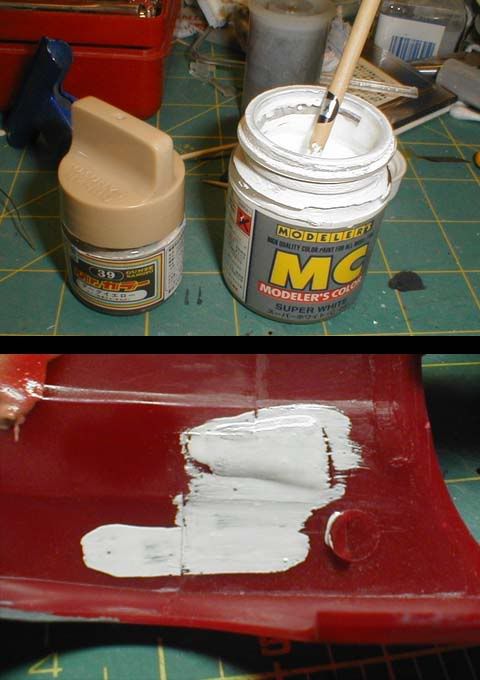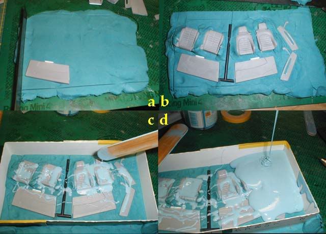 ![]() What am I doing here? Well, determining the layout of the mold. This takes some thinking as I have to minimise the risk of air being trapped. ![]() I started from the bottom left corner (a), and placed the rest of the parts (b). After that, I slowly poured silicone into and details (c). Then I poured some more into the top right corner (d) until all parts are covered. I waited for a few minutes to let air bubbles surface, then I poured a little more until the mold had a sufficient thickness. ![]() You don't necessarily have to use the entire amount of the mixed silicone in the cup. You can let it set at the bottom, and when it's cured, you can dice it up and use them as filler cubes. After one side was done, I repeated the same process and made the other half. Don't forget the mold releasing wax, or you won't be able to separate two halves. ![]() I de-chromed some parts by soaking them in Mr. Thinner overnight. The kit comes with a strip of chrome tape, and it's big enough to make all three mirrors faces, but the door mirrors aren't pre-cut, so I simply used the extra area. I also thinned the tip of the exhaust pipes. Although it's hard to see, the top two are the modified ones. ![]() The brakelights were painted with GSI's Mr. Aqueous Hobby colors. The center circles were masked with baremetal, and clear red was shot through an airbrush (a). I made four circles out of baremetal, and placed them on the back face behind the brakelights (b). When light reaches the baremetal, the brakelights glow (c), but otherwise they look like they are off (d). ![]() I chose black and cream two tone scheme for the interior, and for cream, I used a mix of dark yellow and pure white. Here I'm using Modeler's white. This white is by far the most opaque white I've used. Although I did use gray primer, it's always nice to use Modeler's, so that I don't have to use too much paint, which might make the surface details look dull. To demonstrate the effect of this paint, I painted a part of a red car body from inside. With just one brush application, the paint almost completely hid the color of the plastic. ![]() I rarely use light color for interior, so after some interior parts were painted, I checked the matching with the body color. Since I chose this color combination based on an actual 550, it doesn't seem odd. ![]() I hope the next will be the last update. |
