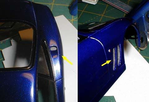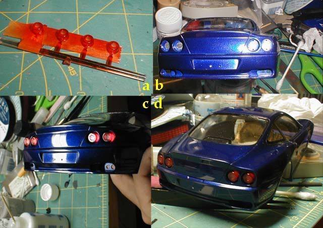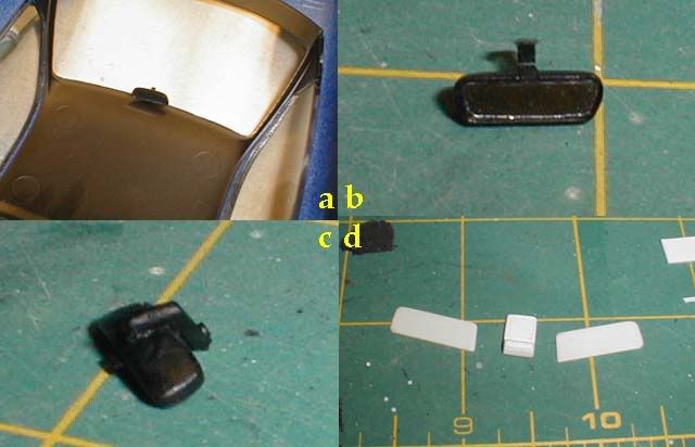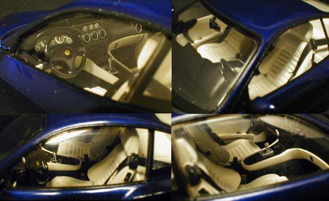 ![]() This is the finished interior. The chrome rings were painted with Model Master Chrome using the smallest brush I have. ![]() I added diamond mesh to the side and left rear openings. I also did the same on the hood (not pictured), but later I discovered that the pattern had to be hexagonal (oops). ![]() Here's another example of Fujimi quality , and I noticed the problem after I glued the part (a).The mirror part is common between the 550 and 575M kits, and the face is upside down for the 550 (correct for the 575M) (b). I cut and scratchbuilt the arm with a piece of styrene The arm shouldn't point straight up, but it's actually bent so the mirror sits a little forward (c). I also made the sun visor and the interior light housing with styrene sheet (d).![]() Okay, this is the last correction on this kit. Those who haven't finished this kit, you're lucky. Those who have built it straight out of the box, check the direction of the wiper arms. It's right hand steering! (damn Fujimi, it's so basic! ) Anyway, I was going to use Modeler's photo-etch wiper set, so the problem didn't bother me much, but if you do the same, make sure you put them in the right direction. (Fujimi might correct this in their later production, but I don't know for sure.)![]() I had a minor problem gluing the interior tub on the chassis. Apparently, the bottom of the luggage part was interfering with the supports from the rear tire housings (arrow), preventing the bottom of the interior tub to touch the chassis. I modified the chassis a bit so that the interior tub sits correctly and don't interfere with the window on the body, but I should have test fit all three parts (chassis, interior tub and the luggage space) more carefully. ![]() The rest are nothing special. I added photoetched Ferrari script and horses made by Replicas and Miniatures Co of Maryland, and added decals. Finally, I polished and waxed the body and it was done. (almost!) *NOTE, I'm painting the wheels with alclad II along with other wheels, so the decals for the hub caps have to wait. Anyway I finally finished my January (supposedly!) project exactly a month later. sigh... From high angles ![]() ![]() Interior pics ![]() Some close-up photos ![]() Is it just me, or the horse seems to have been glued too low? (I should correct that.) Rear view ![]() Well, this concludes the step-by-step building of my Fujimi's 550 Maranello model. Knowing really bad Fujimi kits, I think this kit is very good. I'll check this thread from time to time, so if you have any question, feel free to post it here. Thanks. |