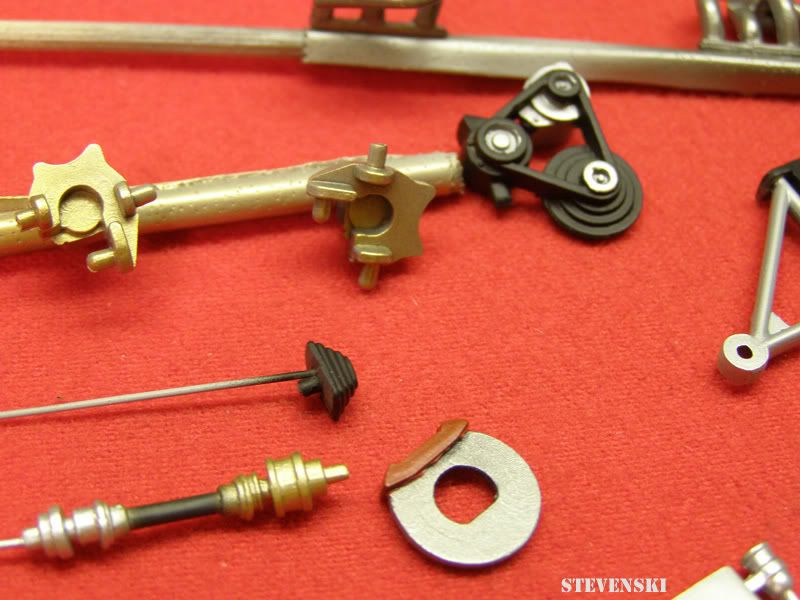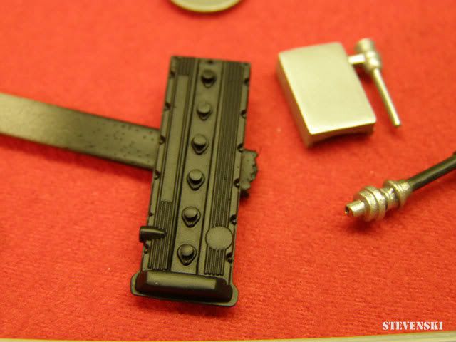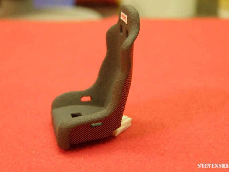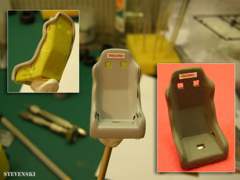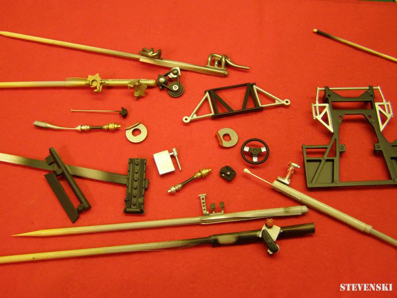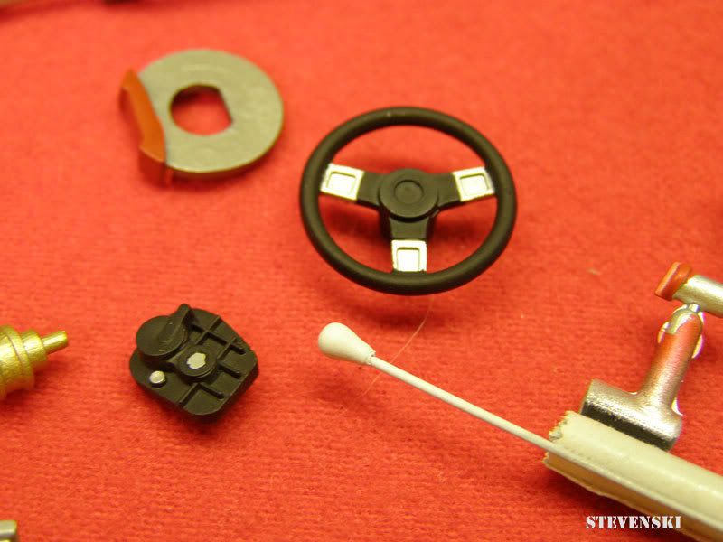 I have the seat finished and it was a nightmare. I don't think I could have chosen a more complicated way to paint this thing! Masking...painting...masking....decaling...masking ....re-painting....masking....clear coating...patching up the kelvar decal where the masking pulled it off....re-masking and re-painting where the Microsol stained the paint....grrrr! LOL For the texture on the seat I used SMS faux-fabric for the first time. Quite impressed and any flays are caused by my heavy handedness and touching it while still wet to see if it wads dry yet – doh! Luckily this is quite easily disguised by stippling with a stiff brush. Before painting with the Faux Fabric, to maintain a flat, recessed area, I masked out a rectangle with plain paper attached with white glue where I would later apply a self-made Recaro decal (just printed on plain paper). After the FF, the seat was painted with XF Dark Grey. The seat back was covered with Renaissance Kelvar decal (my first time with using any kind of c/f and I was quite pleased with how easy it in fact was). The Renaissance decal softened beautifully under Microl and still remained very easy to work with and not at all delicate as I have heard. The kelvar was coated with Vallejo gloss acrylic clear (my favorite clears to date) Heres how it looks. ![]() ![]() Next I went to the block head. Reference pictures showed that the coil packs(?) had quite a distinctive entry pont into the block and the kit part did not represent this very well so I decided to detail a bit with some small slices of styrene rod. Again consistency of size was important and to achieve this easily I made a quick and simple depth jig. First of all I drilled a hole in a pieece of thick styrene the same diameter as the rod. Then I glued a thinner piece of styrene underneath as a backing sheet. After that it was a simple process to place the rod in the hole and cut level with the jig using a p/e saw and get 6 evenly sized pices of rod (we're talking 0,75mm here). The pieces were drilled to accept wire later and glued symetrically (I hope) to the cylinder head. Here's how it looks ![]() ![]() ![]() ![]() Other than that, I have most of the parts detail painted – liquid masking make this very easy as does my airbrush which is so fine and accurate that sometimes I don't even need to mask. Just about everything was cleared with Vallejo Satin varnish. Here's where I am at. ![]() ![]() My favorite pieces are the distributor ![]() and the steering wheel ![]() I've started looking at the p/e parts and I see some problems/dilemmas on the horizon ![]() See ya!