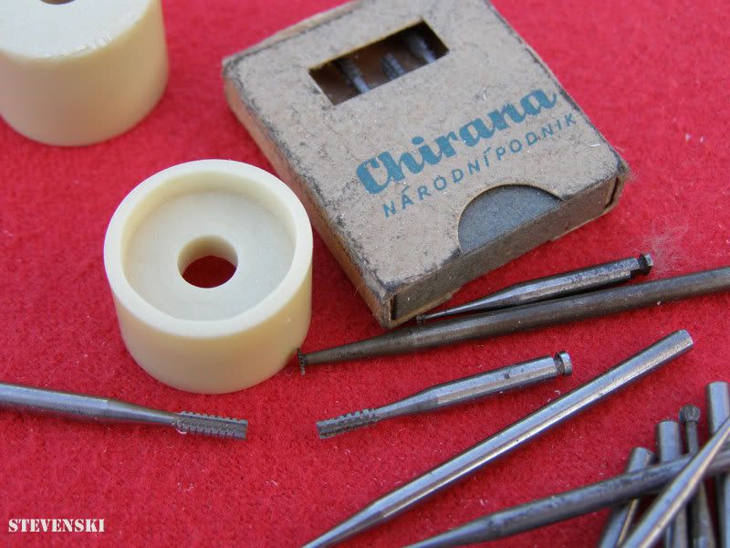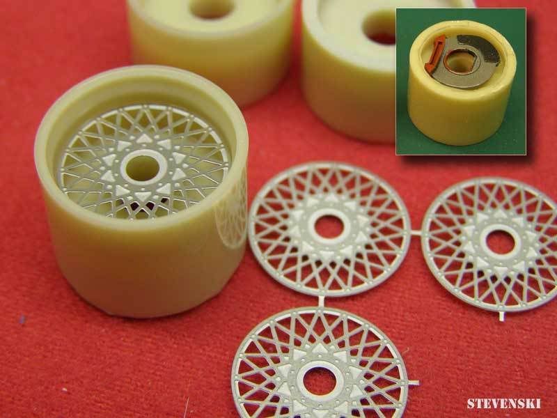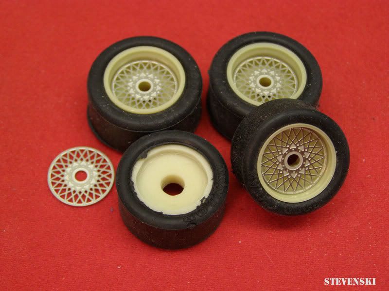 Good job I did because I ran into some big issues that had me really annoyed for a few days and they had nothing to do with Revel ![]() I was actually pretty mad at Renaissance and Scaledesign for a while – unjustifiably I guess, but none the less annoyed. The Renaissance transkit makes the wheel arches so wide that you can forget about using the original kit wheels, they just disappear inside the arches and you need a telescope to see them in there. To modify them would take a lot of work and Renaissance offer no advice/solution for this in the guide sheet (you can't really call it an instruction sheet). On the other hand, when I bought the scaleproduction set, they were OOP on the turned aluminum wheels and offered me resin casts instead. The quality of the casts are excellent but the backs of the rims are cast flat which means that if you try to use the kit rotors, the rims stick out too far from the body (even with the wider wheel arches). The alternative is to not add the rotors and then everything sits fine at the back, but at the front they still sit out too far. I wonder if the turned alu wheels are also like this? The only simple solution I could come up with was to use the Revel wheels at the front with rotors and Scaleproductions wheels sans rotors at the rear. Devil's alternative or what?!!? The fix I came up with was to use my Dremel to “mill out” the back of the resin wheels to allow the brake rotors to sit inside. To do this I used some dentists' drill bits that I got from a friend and the flexi attachment on my Dremel. I just freehanded a line in pencil and made a frontal attack on the back of the wheels checking the depth every once in a while. I wasn't too worried about a perfect look as this won't be visible when assembled but actually the dental drills give a very fine and smooth finish! Here's what I used and a shot of a finished wheel: ![]() This is a comparison of the pre- and post parts: ![]() Here you can see a test fit with the p/e wheel faces and a rotor sitting in its new home: ![]() And this is how the scaleprodcuction.de resin wheels will look using the Revel tires (the scaleprodcuction.de tires are too small IMO and have no mfctr name) ![]() This should be OK now or at least have enough play to allow me to get a good set-up during final assembly. Thanks for looking in Anyone need any dental work? I'm getting better all the time....