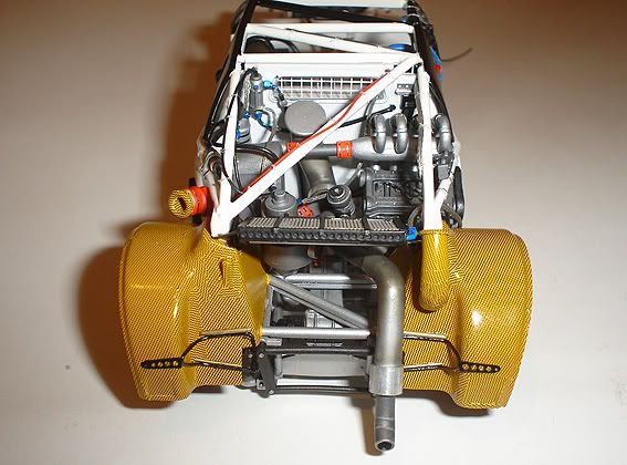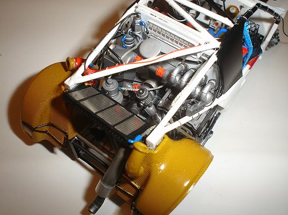 I installed the cage in the chassis and added the protective net in the passenger side: ![]() ![]() ![]() And FINALLY, I finished the engine bay detail!! I scratchbuilt the air ducts for the rear brakes and added final wiring and plumbing: ![]() ![]() I will add the spare wheel and air filter after the body is in place. Time to begin the body!!!!!