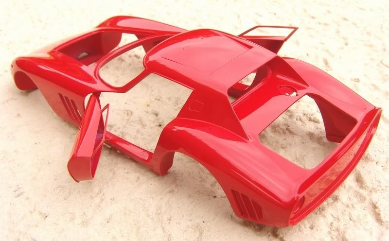 Finally I managed to paint the body.... Here is the process: After a coat of white primer, I carefully sprayed all "hard to reach" places with Italian red - sort of pre-shading of the panel lines, etc. After the paint was dry, I sprayed my 3 mist coats and one wet coat and let the paint to cure. Next day I sprayed second wet-coat. ![]() ![]() Doors, hood and trunk lid were also painted using the same scenario. After the paint has cured for a few days, I have polished it with Tamiya polishing compounds. ![]() ![]() The body was carefully waxed with Treatment model wax. ![]() At this point, I have invested about 25 hours in this paintjob, but I was satisfied with the results. ![]() ![]() Next, the body was decaled, window trim was foiled with BMF, and few body details added. ![]() ![]() There are still few decals missing, but I'm waiting to put on permanent hinges for trunk lid and hood so I could allign decals properly. ![]() ![]() I'm quite satisfied with the results. Wheels were assembled and painted blue. I think the shade is a bit dark... so I'm still contemplating stripping them and re-painting - we'll see. ![]() ![]() Seats were cleaned and upholstered with Model Factory Hiro adhesive cloth. I also painted front suspension and started working on the rear. ![]() ![]() Chassis was cleaned and painted flat black. And finally, I did a mock-up to see how everything fits together - check the stance and ride heights, etc. ![]() ![]() Looks good to me! ![]() ![]() Thanks! |