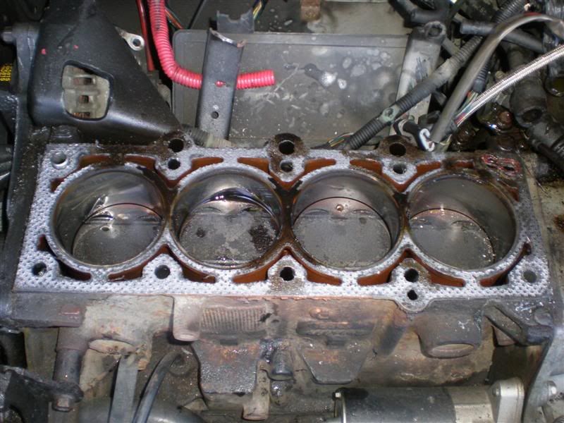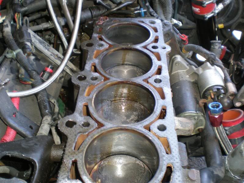 I was doing some work on her yesterday morning, did some waxing, and getting MSnS wired up more (is about done too) and fixing some vacumm leaks I had that were causing bad idle surge and took her for a test drive to make sure it was all back together good. Car was running great. Was pulling super hard so I kept pushing her a little more and more. Coming off an on-ramp back onto the expressway I punch it in 2nd and the car just sat there. So while driving I kept her in 4th gear and was watching the laptop to see what was going on. I needed to get over lanes so I did with some power and then it started running bad. I got off close to home and on the exit ramp I popped it out of gear and it came close to dying. I turned on the street and there's a consistant knocking sound, like something hitting something. I took a side street blowing through all the stop signs. The knocking got louder. Sounds like something solid, and it raises with rpms. Doesn't sound like anything knocking around in the chamber or anything. The thing was dying when I had to stop and taking some time to crank back up. I barely made it home and opened the hood. Seemed extremely hot under the hood for some reason, although IAT temps were at ~91*. Was a cool day. I revved it and sure enough you can hear the knocking from in the block. Look under the car and oil is leaking out. I can't see where since it's dripping on the cross-member and dripping off that then. And my lifts are at my parents. I'm thinking I spun a main bearing and it's the crank wobbling. So I got impatient and started pulling it apart yesterday, no more than 7 hours after it blew. Was planning on having the head off today, but looks like I'll be getting drunk at a BBQ instead. But pulled the VC off and the cams and springs all look good. I really hope all the valves are good. Then I'll pull the head apart, get it all cleaned up and washed and it's going on the new block. ![]() And yes that's part of the compression tester stuck in #3