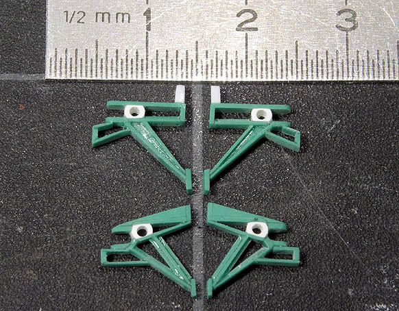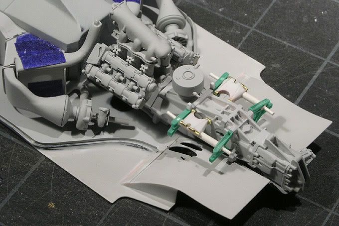 To make things worse, while taking measurements I realized ( as I mentioned in my last update ) that the top of the gearbox was too low relative to the body parts that sit between the suspension arms and the rear end of the cowling. First I thought I could just raise the whole engine a bit to fix that but then the lower parts would have been too high relative to the undertray. O.k…..we’re talking of around 1 to 1,5mm but in scale that makes a difference. After checking around my pictures it turned out the “cast in” stiffeners of the box top could be a bit higher and still look right. So I raised those features with styrene bits. ![]() Like this the suspension pieces would come higher as well and the rest ( if necessary ) could be fixed with them. I also found another thing to fix while doing all this reference checking. In the Tamiya kit the rear dampers sit on the flat sides of the gearbox but in the top view of the real thing that comes a bit further down the post you can see there’s actually an indentation in the casing on both sides. I can’t tell from my pictures if it really goes all the way down but later this will hardly be visible anyway. Without it I would have had trouble soon after fitting everything together. There’s a forward and rear subframe on each side that hold a turning element which connects them and the pushrods with the dampers. You can see the assembly on the real thing in this picture. This looks nice… but very complicated ( and heavy ) compared to the layout on current cars. ![]() In the next picture you see the scratchbuilt model subframes. After my failed attempt to do them in brass I gave it a try with Ureol because that’s stronger than styrene. I then found out it’s also nicer to work with for this application and I think I’ll use it more often now. The upper parts are the forward arms. I wouldn’t bet on their shape being correct because in my photos they are mostly hidden by other parts but that will be the same on the model so who can tell :-) ![]() The arms are made from 0,2 and 0,4mm thick bits superglued together. This involved a lot of sanding and filing but ultimately worked out fine. The front and rear arms are built up from 13 and 17 individual pieces respectively….quite some work. This really put a miniature CNC-mill very high up on my wish list….. seems I have to start playing the lottery:-) So far the pieces still look a bit messy in places but some primer and careful sanding should fix that. In the next picture you see them sketch glued to the engine/gearbox that I finally primered in the meantime. ![]() Next up is the top view of the real assembly that I mentioned before, taken from over the rear wing. There’s a lot going on! ![]() My next step were the pieces that run longitudinally between the arms and connect the vertical dampers with the pushrods. I have no idea if they have some technical name but I guess you know what I’m talking about:-) I had made these two already some time ago and of course now they didn’t fit exactly…. That’s the problem with scratch building these things….you basically have to build everything at the same time to make sure it fits or you have to change some pieces later on. I was lucky though and didn’t have to rebuild them. I could correct the boxy parts that hold the dampers and now they fit. Here you see them test mounted together with a bunch of other primered engine pieces. ![]() Now I can also carry on with the rear dampers and fit them. After that the exhaust pipe will follow but to know where this will go I turned my attention back to the undertray. After rebuilding the rear end of it at the very beginning of this project the original “exhaust” was gone but it was crap anyway so now I had to rebuild it a bit nicer. Normally you don’t get to see this area of a F1 car ( especially these days ) but luckily there was one MP4/4 high up on display at Goodwood last year ( see the very first picture of this thread ). I almost missed this opportunity at the show but late Saturday afternoon when they had closed the access below the display for the evening’s party guests I still managed to get a shot with a tele lens. ![]() Funny enough the vertical diffusor fins are missing on this one but you get to see the exhaust heat shields and skid block in the centre. I built the fins from 0.2mm sheet styrene using the original kit pieces and some other photos as reference. The skid block is a photo etched brass piece. The heat shields would have been obvious parts to be etched too, but when i did the photo etching I thought I couldn’t “pre”-decide the shape of the holes for the exhaust pipes without having the actual holes and that their elliptical shape would “develop” when drilled in the undertray. ( Jeeez that sounds complicated…but I guess you get what I mean ). Anyway I was wrong :-( After drilling the holes they looked nothing like on the real car so I shaped them like on the picture with a lot of careful filing and sanding. The heat shields are made from 0.1mm nickel silver sheet and i had to be very careful not to bend them in the process. ![]() At the moment they are polished but they’ll lose their shine later on and get some “rivets”. That’s it for now. See you at the next update:-) |