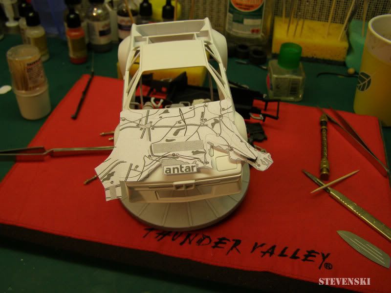 ![]() I am planning to give everything a really heavy hand with the dirt when it's all together. One of the things that I do like about my short supply of reference pictures is that they show that this car looked like crap at the race!! It was beaten to sh*t and held together with Duck Tape! ![]() So, I'm going to read all your and Phil's and Sean's and XX's threads again and have a go at weathering the car up to "race condition" (actually, it will be an excuse to cover any bads that I make )PS How do you like your spaghetti?