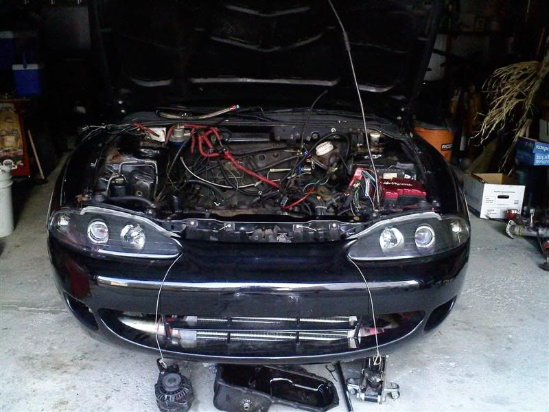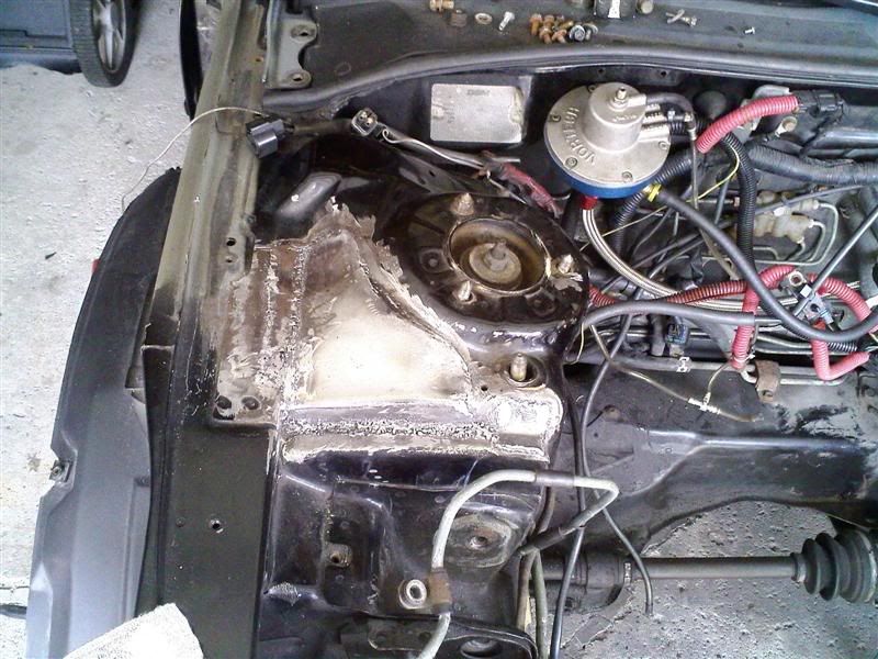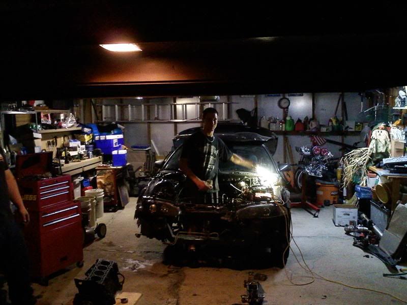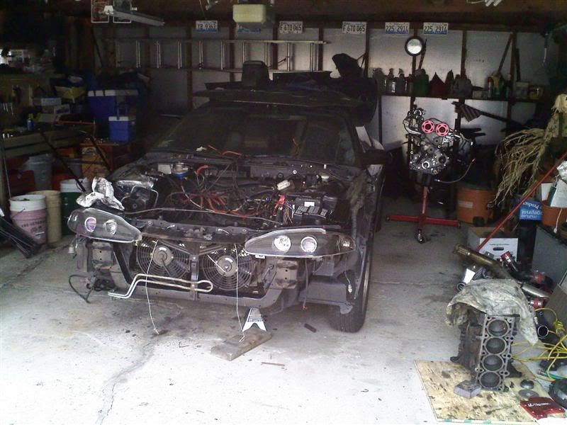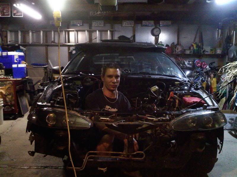Cut out the rusted strut tower yesterday and bought some 22ga sheet metal. The rusted part basically fell right off of the car. I think my parents have some pics of the hole I made but I don't here at my place. I took the metal and did some basic bends with it, tacked into place, and then used a torch to shape the rest of it. I then welded it the rest of the way. Apparently, 22ga is too thin for even the lightest setting on my welder. I kept burning holes in the metal that I had to keep patching up. Plus the paint stuff inside the wheel well kept catching fire while I was working on it. Took 2 days to get nearly what I wanted. I have to prime, sand, prime, sand and then paint it up good. So keep in mine this isnt the best looking right now. However, the metal took shape really well and is solid in there (which is really all that matters) ![]() Made mounts for the FMIC so it'll be level for this time around. Not installed yet, but is ready to go. Going to be running the same one I was before until I max out its efficiency. Pic of some misc parts. ![]() Got the upper IM installed along with the IM heat spacer. Should help keep IATs down a little I'm hoping. Oil pickup, oil pan, and crank scrapper are all installed also. And lastly, all the oil lines for the turbo are ran. -10an return and -4an feed still. Purchased new oil pressure sender from GlowShift since I ruined the old one and have all that installed on the back of the block. EGR system entirely installed now also. Back shot of the motor. Little dark. ![]() ![]() Lastly, with the slimline fans, I had ghetto-rigged them to the front of my radiator so they really didn't stay up there too well. They never fell off or out or anything, just tilted funny sometimes and I'm sure wasn't doing the best job they could be. So I bought some metal brackets with the holes in them every # of inches and cut that. I attached it where the bolts for the headlight (bottom) go and used longer bolts and then buts behind the brace. Actually works out extrememly well. The fans will then be mounted to the brace via their brackets and probably some zip ties in front of the radiator (push style instead of pull). I can also then hide the wires for them inside the front radiator support and basically makes those disappear. When the radiator is in place, it sits totally flush with the brace/fans. The I'll just add some rubber pieces behind the braces so they don't vibrate on the radiator. Don't have close ups of everything yet until it's done, but I think it's turning out extrememly well. ![]() And last but not least I ended up cracking up my buddies car that I've been borrowing for a week. Had the right-away to turn left and lady hit me.