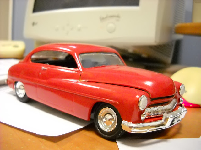 This is a kit I finished about half a year ago. Basically to start with, I got rid of the side pillar and the window supports. It sat completed for a while and annoyed me everytime I walked past. I wanted to chop the roof but I didn't know how and didn't have the guts to chop it. One night I said, stuff it! I'm finally going to chop it. I basically chopped the roof around 7mm and extended the back of the roof with a piece of a 1953 Belair and putty. I also changed the wheels to wheels from my Revell 29' Pickup.