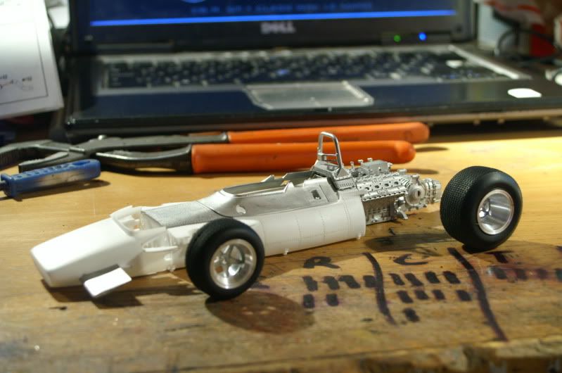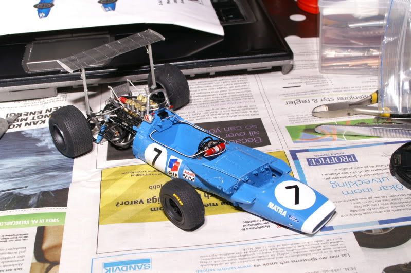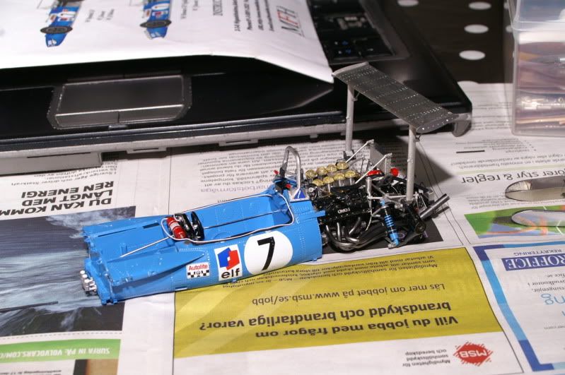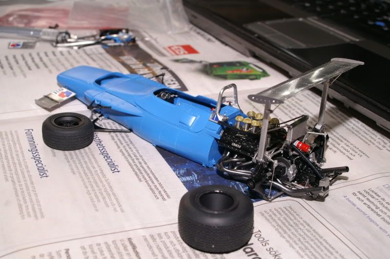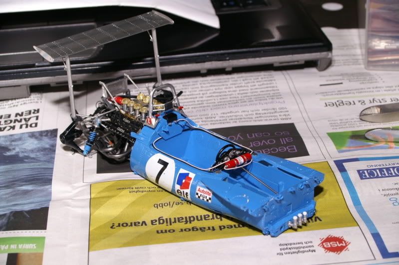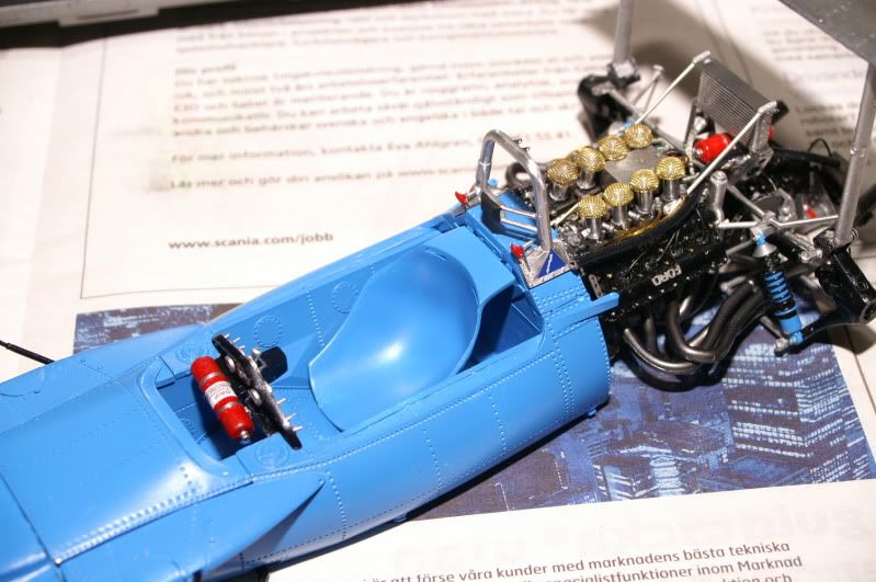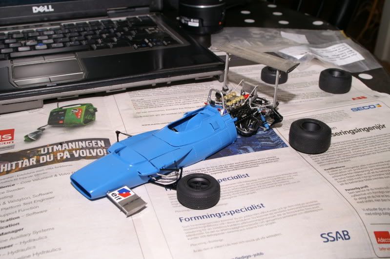 Finally made some progress on this. I have been missing some parts for my air brush. They arrived during the week so now I have been able to do some painting. I used Zero paints French blue for the monocoque, might not be perfect in shade but I'm happy with it. I also got all the black parts painted and the wheels are painted in model master exhaust. Next up is some clear followed by decals.
