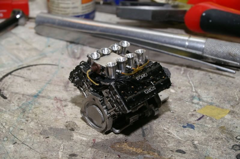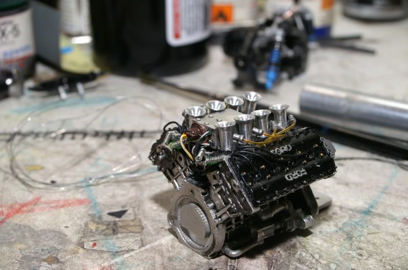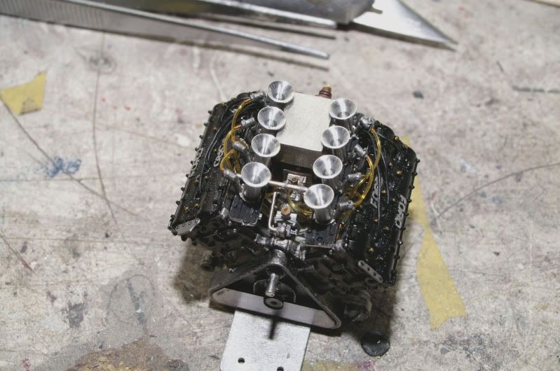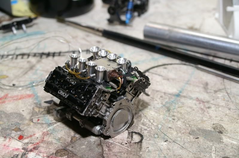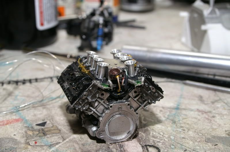 The engine is nearing completion. Right now it's just "box stock", haven't added anything except for the supplied details. I'm going to add some more wires and the rest of the throttle linkage. The fuel lines were a real challenge to add, it's extremely tight between the intakes where the fuel pump is located. ![]() ![]()