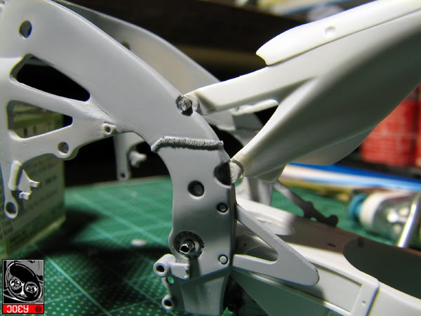 ![]() Some heavy sanding work is needed afterall. And some minor changes at the frame has also been followed. ![]() Just noticed those bigger holes at both side are relocated at a bit lower position. ![]() After these major adjustment on the frame, I have set things up a little but found the hinge at the swingarm was a bit too wide. Adjustment was made to allow a much proper fitting with the rear fairing.