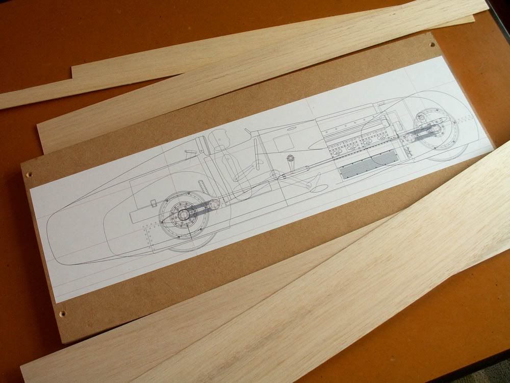 ![]() I've based the plans on the size of Frank Lockhart, the tyres available at the time, engine dimensions, a few photos and a cutaway drawing. ![]() My initial idea was to use 1/8th drawings that were reproduced in the 70s, but I decided that the dimensions were taken from period photographs and no allowance was made for lens parallax, which distorted the bodywork. ![]() The true engine dimensions would not fit the body plans so I redrew them, cut the parts out and photographed the car as a cardboard mockup, using various lenses. The drawings were tweaked until the proportions of the car fitted the old photographs when overlaid in Photoshop...very time consuming and hopefully worth it!!! ![]() The balsa then made another appearance, and off I went! ![]() The brass tubes were bonded into the frame for reference for my axles. They also serve as the locating pins for both halves of the body. This allows me to get one side correct before shaping the mirrored side - a lesson leant from my RS60 project. Here, the body has been planked and drilled ready for good old P38 car body filler. I'm trying to aim for around 4mm depth to keep the strength in the master. The black ribs will be ground out and filled when it's looking OK. ![]() I intend to build this as a curbside in fibreglass but hopefully will shape the spats from thin aluminium sheet. If I feel courageous, I may cast them in pewter. Not sure how quick this project will be as I have a very hectic year on the way...keeping it as a curbside will hopefully speed things up a bit, who knows! ![]() Oh, and I forgot to mention this thing is huge...600mm! |