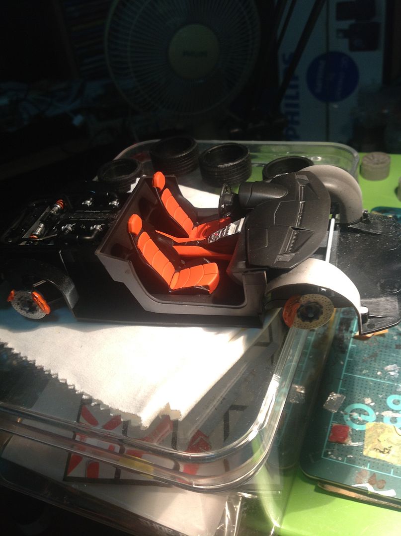 Don't panic. I know this looks confusing I'm sorry for missing some information.The paint is a mixture of no.59(orange) and no.47(clear red) to ratio of 5:1, I'm going to use the resin ADV1 for the wheels