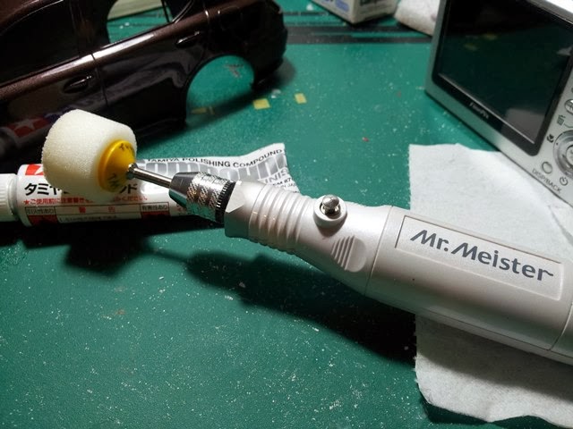 I know most of you are now preparing for the winter, but here it is now getting hotter and hotter. I should be patient to keep myself from going fishing but modeling.The polishing process has been started on my Lexus. ![]() #3000 Mr. Hobby's Polishing Cloth, and #6000 Laplos, then Soft 99 Fine Compound applied. After every process, I washed with dish washing detergent. ![]() Then Tamiya Course Compound applied. Still fine scratches were seen, but these would go away after the next step. ![]() Tamiya Fine compound applied. most of scratches had gone. ![]() Tamiya Finish Compound applied. I am happy with this result!! These are the weapons for this build. ![]() "Sujiborido's micro polisher 123" on Toyo Associates' Mr. Meister Pen-type motor tool "PT-αⅡ". To apply compounds with this combo, I set the rotate speed very low. These combos made the job much easier and quicker. I don't feel any numbness on my hand. ![]() Now I'm sure I'll be finishing this one very soon happily. What a good rehabilitation! ![]() See you soon