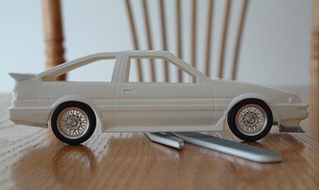 The car is a 83-87 (I think) Corolla in America and Trueno in Japan.. The chassis code is AE86 and the model kit is sold everywhere, in different forms, of course.. But there is a licensed Drift King Tsuchiya Levin availible, which is a different front end... but check out MechaHawaii for the model by Fujimi and tell him that Miles sent you ... PEAS!!!!!