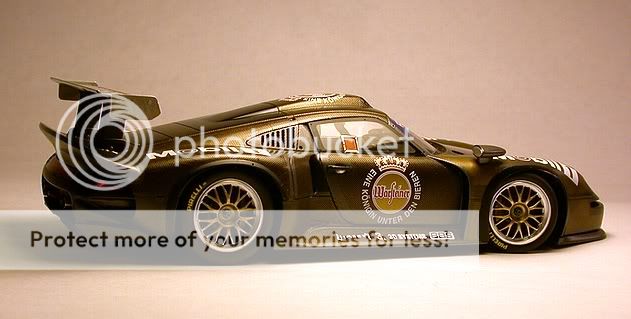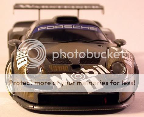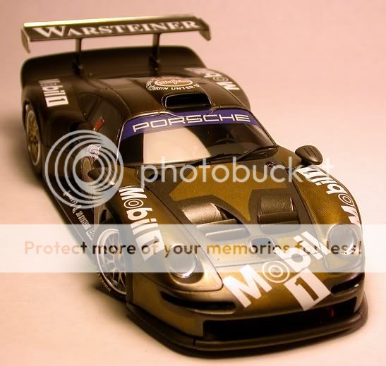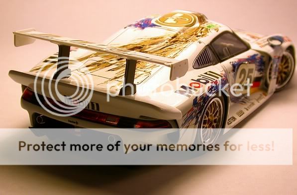So enjoy! and thanks for looking, Bill Tamiya 1:24th Mobil 1 Porsche GT1. ![]() Built basically box stock with little effort to engine/chassis detailing, most of the time was spent on the external surfaces. ![]() Scale Motor Sport CF decals were used (where necessary) in conjunction with Tamiya's stock decals. All over a basecoat of Tamiya TS-26 Pure White that was rubbed out using Meguier's products with a final overcoat (including decals and glass) of Turtle Wax Ultimate Carnuba wax. ![]() Tamiya X-18 acylic paint was used on the underchassis and the recommended mixture used on the mirrors. ![]() Exhaust pipes were replaced with K&S Engineering aluminum tubing grafted onto the stock headers. Wheels were painted Model Master's Non-Buffing Brass with scratchbuilt wire locking rings painted Testor's Guard's Red. ![]() A combination of SMS and Scale Race Cars (SRC) photoetched details were used on the wing supports and end plates. Mirror faces are polished K&S aluminum sheet. ![]() Body release latches are from a recent sheet of SRC body latches (SRC109) with washers from SRC108. ![]() ![]() All in all, a beautiful kit and just a few more pieces to finish her off! Hope you all enjoyed and if you have any questions...please feel free! Thanks, Bill Last edited by bvia; 06-16-2004 at 10:40 PM. |