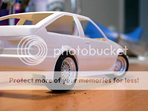 Is it going to be painted as per the box? I reckon you should paint the wheel centres charcoal or gloss black...Those damn mesh rims, they come in stacks of old fujimi kits, and they don't suit any of them... :| Should be an interesting project. I just ordered a levin kit and some volk TE37 rims, I'm hoping to make a quasi replica of Gen Terasaki's D1 car...