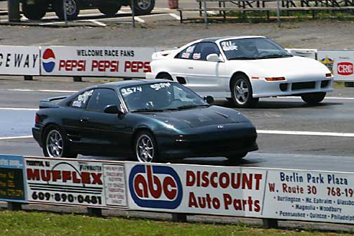 Fabio is a great friend. You have to realize he has been racing on that hill for 5 seasons now. This is my first time. I can't explain the challenge of racing on a road at 110 mph+ that is not straight. Also, he was on sticky autocross tires. I was on my normal street tires. It was a fair fight (expereince & tires against HP) and he won. I have drag raced him many times. He has a white 93T MR2 and a yellow 91T MR2. Here is a photo of me drag racing his white 91T. The blue you see behind my car on the ground is the 60' line ![]() IIRC, I ran 12.2 and he went 14.2 ![]() You can see more pics and stuff of his cars here: http://www.jekylhyderacing.com/fabio.htm