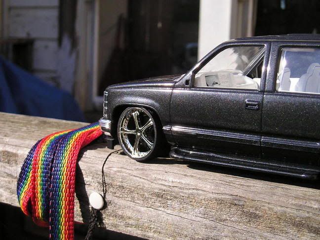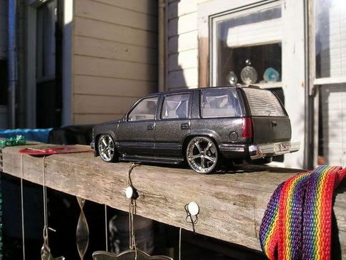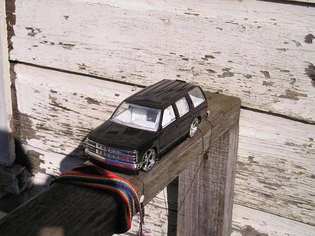 I completed this awhile ago but since the weather has been bad I couldn't take pictures. The paint is Testors Mettalic Black and Testors Flat White Interior. It has Hoppin Hydros subs and I don't know where I got the amps from. The rims are Hoppin Hydros Bersaglios(sp?). I accidently broke the steering wheel and gauges so I decided not to mess with them.