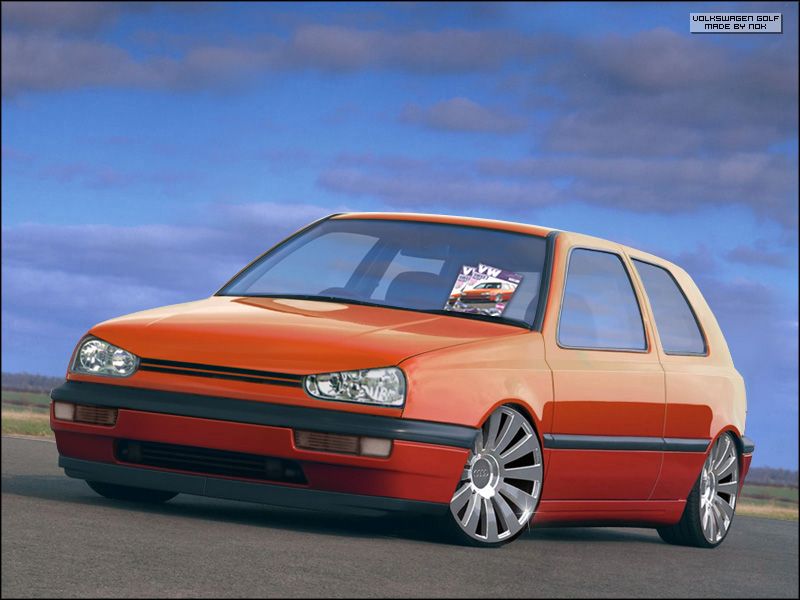 mods are: - 3 door conversion - mk4 style lights + bad boy bonnet - total smooting (doors, bumpers, bonnet, mirrors etc) - lowring + audi a8 rims (yes, audi logo is still there on purpose lol) - new grille without VW logo - new fog lights - background swap ![]() ![]() hope you like it ![]() cheers |