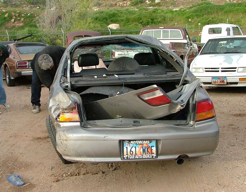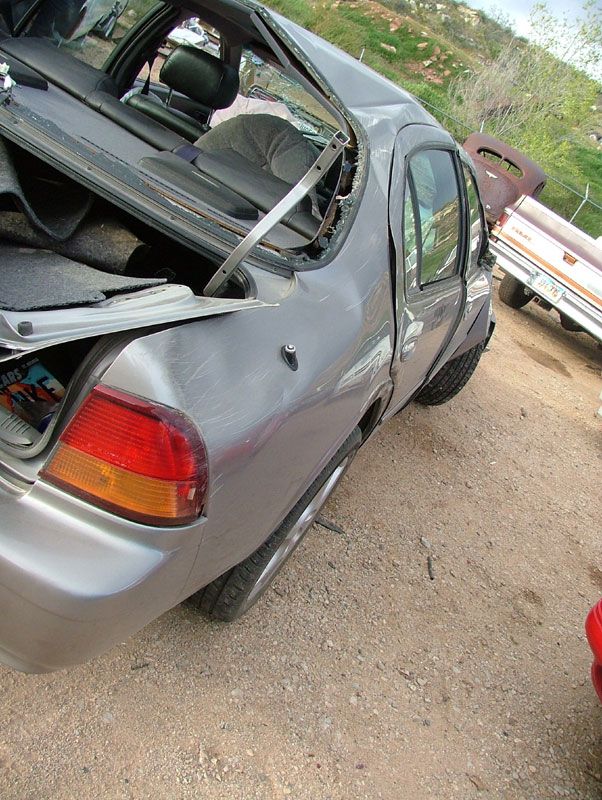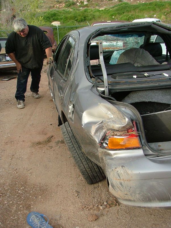 ![]() 4508 - see how little damage is done to the finish. They say it was a "bounce" not a "roll", meaning the car landed hard when it wasn't airborne. ![]() ![]() 4510 - the back wheel is all skeewampus, because the entire back suspension broke and the axle is held on by springs only. Notice the carseat somehow got smacked over. ![]() 4511 - from the back. Trunk lid was about 15 feet from the vehicle. Contents were everywhere, tow truck guy was nice enough to pick them up. Our air compressor did not survive. ![]() ![]() ![]() ![]() 4517 - There you have a brand new 40,000 mile tire with less than 1 thousand miles on it. And a nice, new disc brake with very few miles, snapped completely in half. ![]() 4520 - back drivers wheel. Nice new tires! ![]() 4521 - the opening Mac crawled out of. ![]() ![]() 4531 - Those are tire marks. Yes, on the outside of the wheel well. The back suspension was totally gone and the wheel was out and up on the side of the car. When they tipped the car back down, the wheel went back into place since the springs are still attached. ![]() Ready for the irony? 45 days ago we had two cars. Sold the Infiniti on Feb. 15. Now, we have 0 cars. Both front airbags deployed. The driver's side airbag deployed. Mac was seatbelted. The car rolled from 6-12 times according to witnesses. The tow driver was impressed at how well the structure of the car held up, considering the "bouncing" roll. Mac has a welt on his forehead, we think he got hit with a metal CD case kept in the car. He has a concussion but is otherwise going to be fine, albeit a little sore.