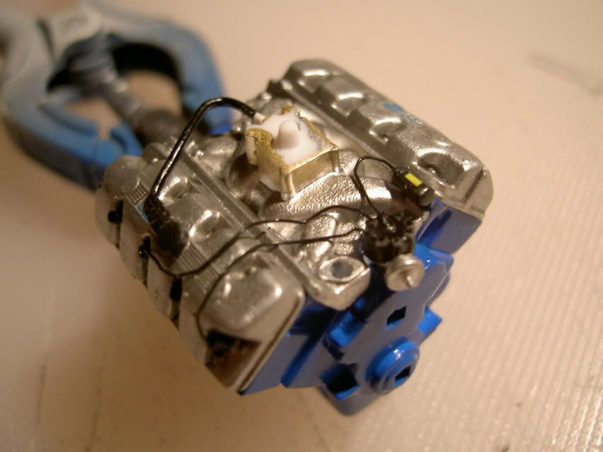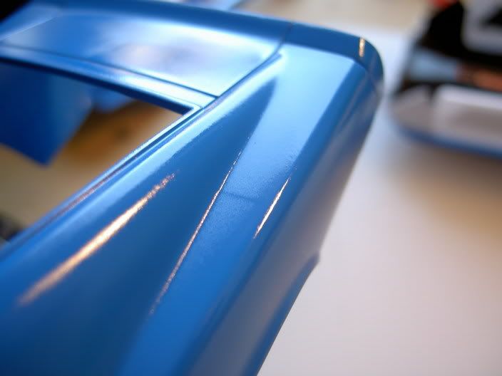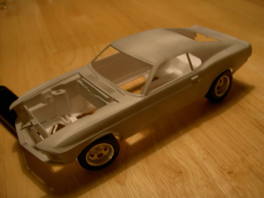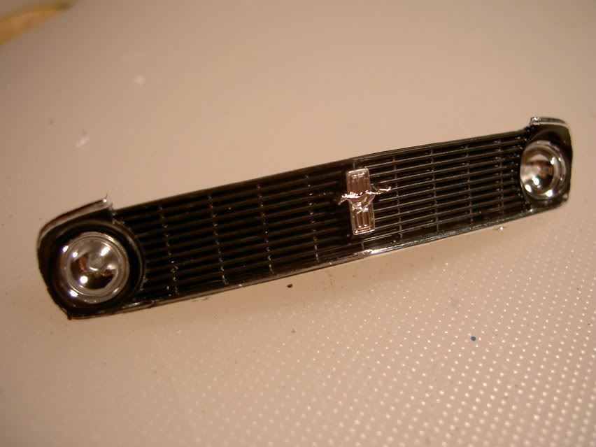 First of all a pic of the Boss with her cool magwheels and primer. And here`s the grille. note that bulbs have been added ( made of clear styrene scrap ) Mustang-logo not yet detailed And so time for slappin`on some color. I wanted Grabber blue, but i think this old "friend" , Tamiya TS 44 Brilliant Blue also works! But on the path to the perfect paint, something went slightly wrong ![]() There are swirlpatterns in the plastic wich look like they`ve "etched" the plastic. Sanded and primered, painted color, sanded the color slightly with 3600 polishcloth, and a few layers of blue. Still swirlmarks Will wait a few days, the start with polishcloths again, and see if it gets any better Maybe iīll clearcoat it with Tamiya clear.Ok, as a last treat, a during construction-pic. The molded-in brakeservo looks more like a horseshoe, so i had to whack it away and put 1,5mm styrene in its place. A servo from another kit will take it`s place.