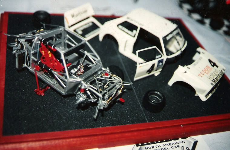 I'm very honored to hang with all of you. I've managed to spend a little time checking out your rides and they are all impressive. I hope to be able to check out more of them when I get the chance. I looked for any photos of 1/24th scale stuff that I've built but I only have a single one (a fellow contestant snapped the photo for me). It is an old scratchbuild from 10 years ago. I took the bodyshell from a Tamiya Golf kit, modified it with mondo fenders and wings. I then scratchbuilt the entire chassis with a mid-mounted twin turbo V-6 with intercoolers and four wheel drive. I wanted to build a fantasy car to compete in the Pike's Peak hillclimb. Afew years later, someone fielded a twin engined VW and then Suzuki did a number of twin-engined "Unlimteds" also. Sorry about the poor photo quality. Thanks again and cheers. Mike Villena